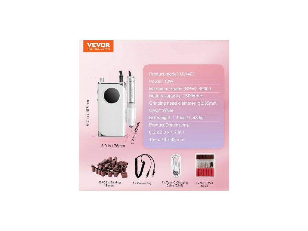 Průměr brusné hlavy: φ2,35 mm, Kapacita baterie: 2600 mAH, Barva: Bílá, Číslo modelu: UV-401, Rozměry produktu: 6,2 x 3,0 x 1,7 palce / 157 x 76 x 42 mm, Maximální rychlost (ot./min): 40 000, Čistá hmotnost: 1,1 lbs / 0,48 kg, Výkon: 10 W