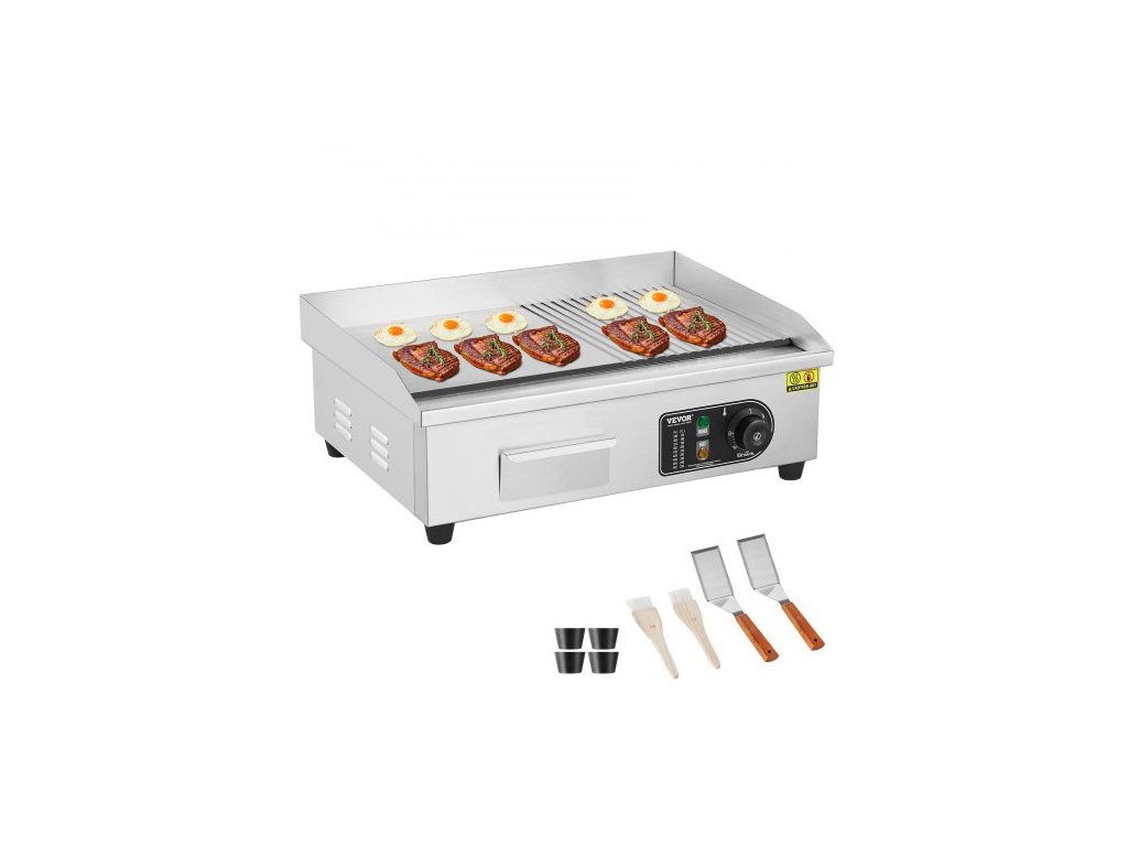 Komerční elektrický gril, 3200W stolní gril s polovičním plochým povrchem, nastavitelná teplota 122℉-572℉, nerezový gril 21,26x11,81x0,39 palce se 2 lopatkami a 2 kartáči pro domácnost nebo restauraciElektrický gril