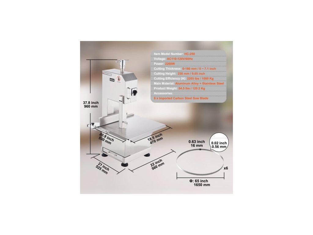 Rozměry pracovního stolu: 470 x 530 mm / 18,5 x 20,9 palce,Výška řezu: 230 mm / 9,05 palce,Účinnost řezu (H): 1000 kg/H / 2205 lbs / H,Napětí: AC220-240V/50Hz,Tloušťka řezu: 0-180 mm / 0 ~ 7,1 palce,Číslo modelu položky: YF-400A,Hmotnost výrobku: 54,5 kg / 120,2 lbs,Rozměr pilového kotouče: 1650 x 16 x 0,56 mm / 65 x 0,63 x 0,02 palce,Rozměry výrobku: 560 x 525 x 960 mm / 22 x 21 x 37,8 palce,Příkon: 2200 W,Hlavní materiál: Nerezová ocel