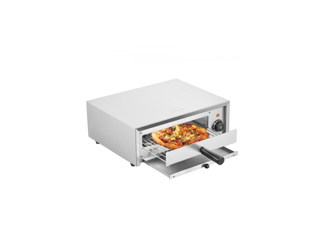 Elektrická pec na pizzu , stolní, 12 palců, 1500 W, teplotní rozsah 0–300 °C, konstrukce z nerezové oceli a snadno čistitelný plech na drobky, vhodná pro komerční i domácí použití.