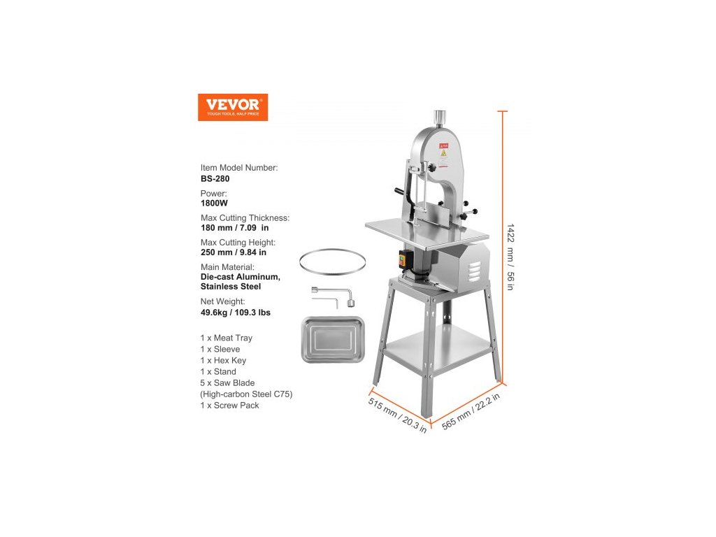 Číslo modelu položky: BS-280,Maximální tloušťka řezu: 180 mm / 7,09 palce,Rozměry pracovního stolu: 15 x 19,1 palce / 380 x 485 mm,Rozměry pilového kotouče: 65 x 0,63 x 0,02 palce / 1650 x 16 x 0,56 mm,Maximální výška řezu: 250 mm / 9,84 palce,Čistá hmotnost: 109,3 lbs / 49,6 kg, Příkon: 1800 W, Hlavní materiál: Tlakově litý hliník, nerezová ocel, Rozměry výrobku: 20,3 x 22,2 x 56 palců / 515 x 565 x 1422 mm