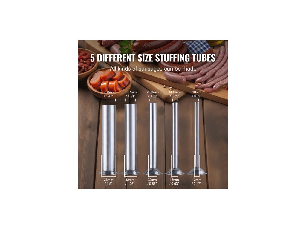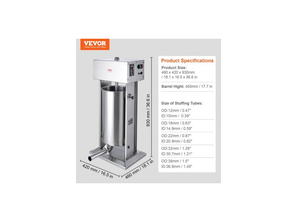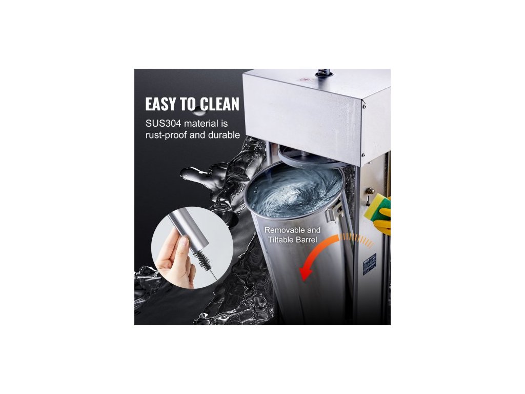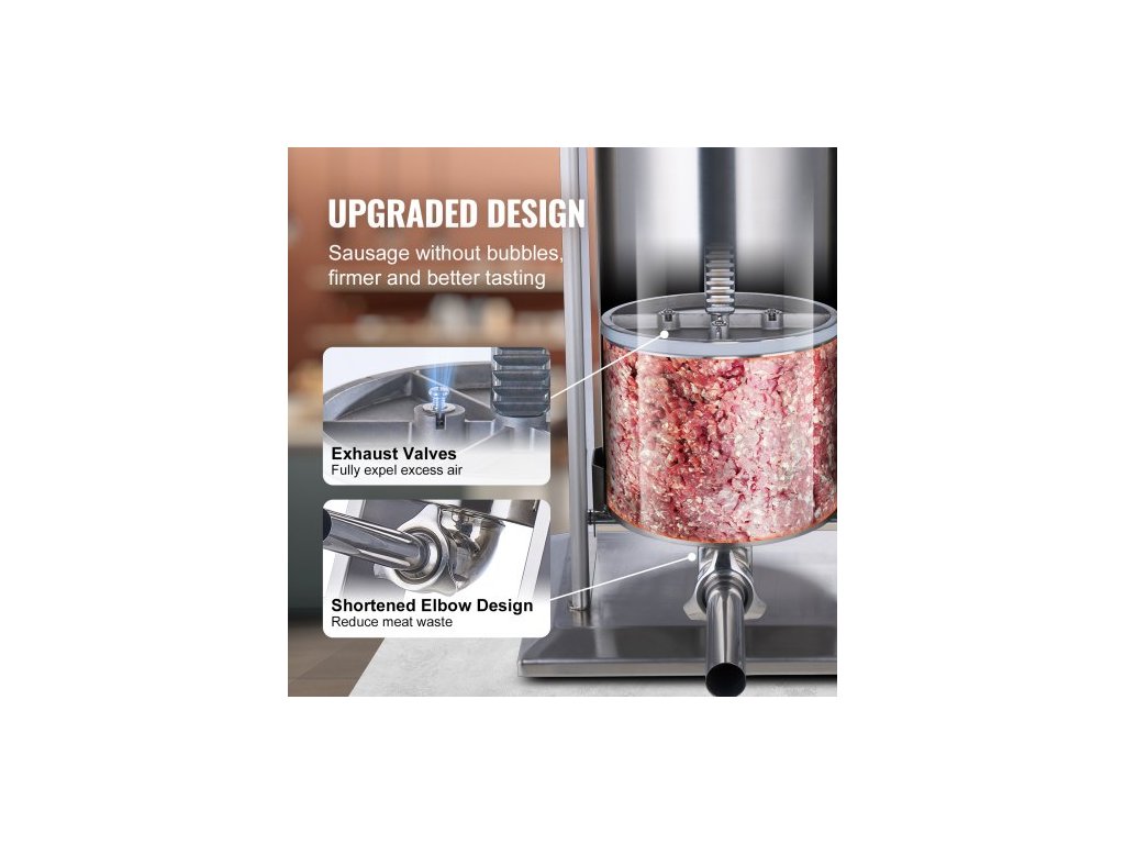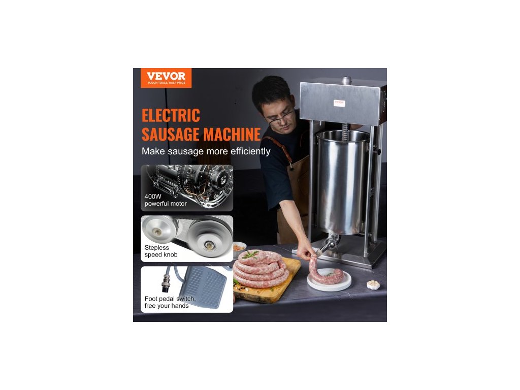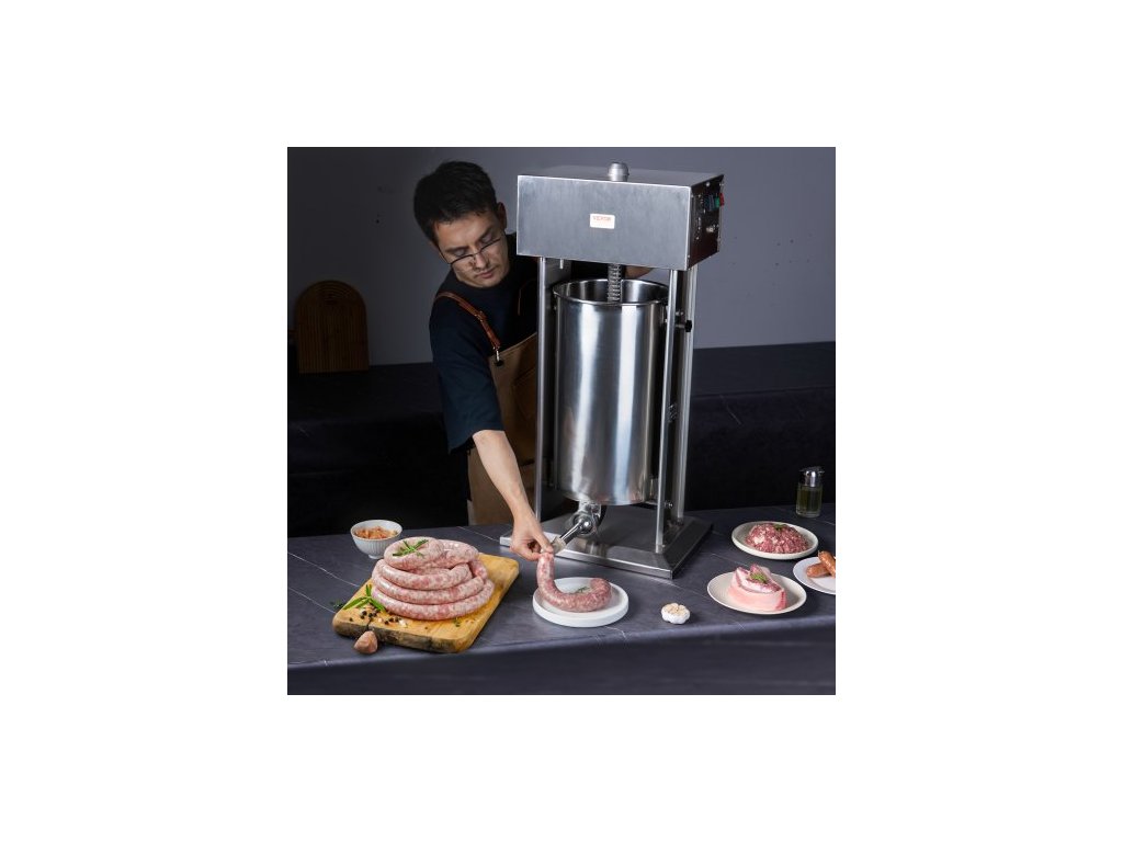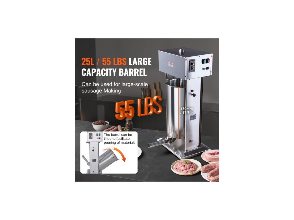 Elektrická plnička klobás , vertikální plnička masa 25 l / 55 lbs, motor 400 W, plynulá regulace rychlosti a nožní pedál, vyrobeno z potravinářské nerezové oceli 304, 5 plnicích trubic pro domácí i komerční použitíKomerční stroj na klobásy
