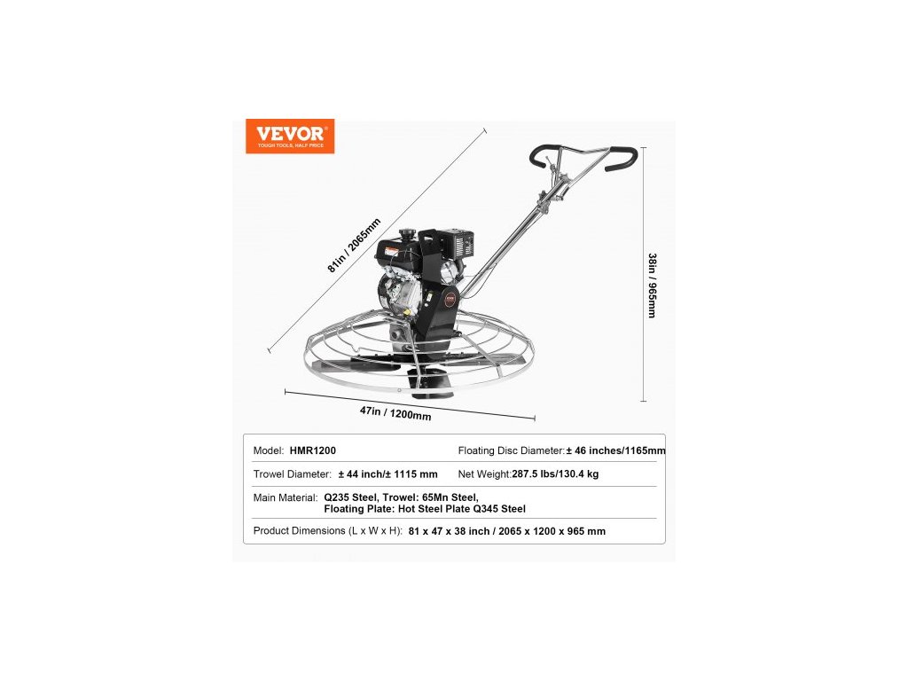 Materiál hladičky: ocel 65Mn, materiál plovoucího talíře: horký ocelový plech Q345, model: HMR1200, průměr plovoucího kotouče: Φ46 palců / Φ1165 mm, rozměry výrobku (D x Š x V): 81 x 47 x 38 palců / 2065 x 1200 x 965 mm, čistá hmotnost: 287,5 lbs / 130,4 kg, průměr hladičky: Φ44 palců / Φ1115 mm, hlavní materiál: : ocel Q235