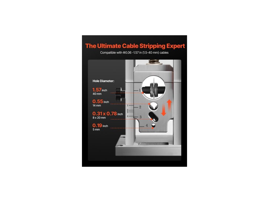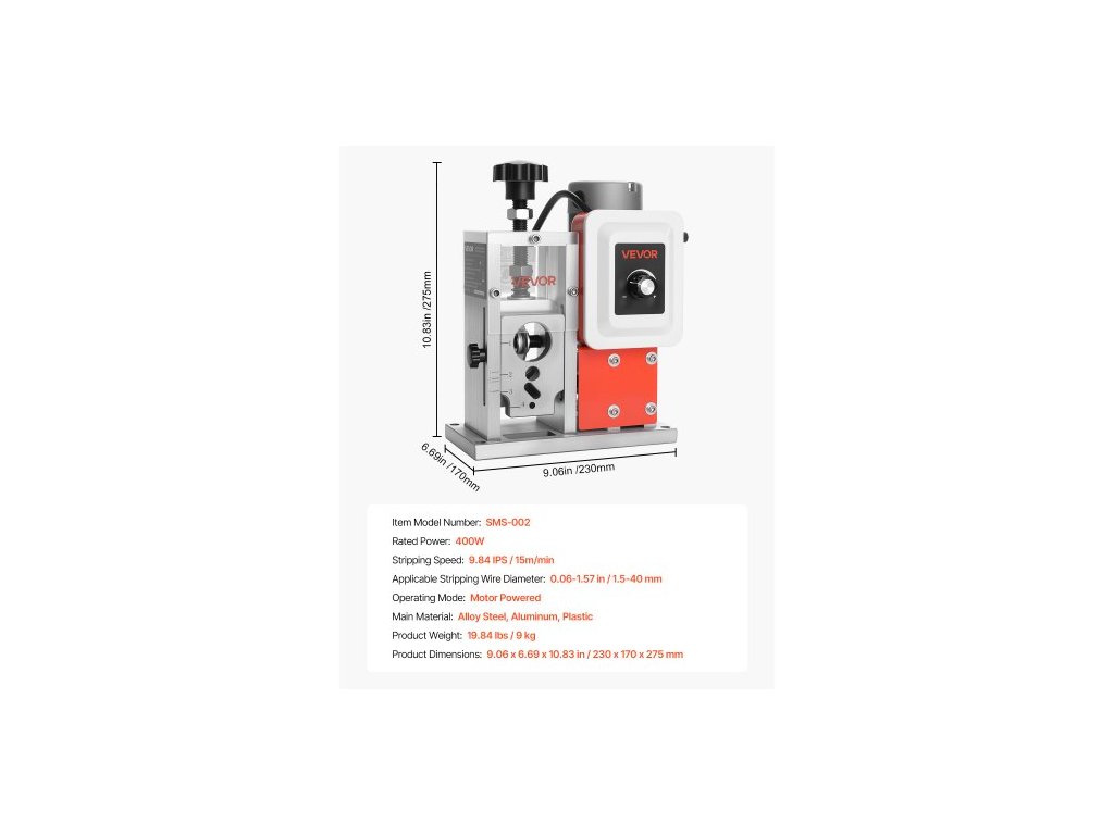 Použitelný průměr odizolovacího vodiče: 0,06-1,57 palce / 1,5-40 mm,Hlavní materiály: Legovaná ocel, hliník, plast,Číslo modelu položky: SMS-002,Hmotnost výrobku: 19,84 lbs / 9 kg,Provozní režim: Pohon motorem,Jmenovitý výkon: 400 W,Rozměry výrobku: 9,06 x 6,69 x 10,83 palce / 230 x 170 x 275 mm,Rychlost odizolování: 9,84 IPS / 15 m/min