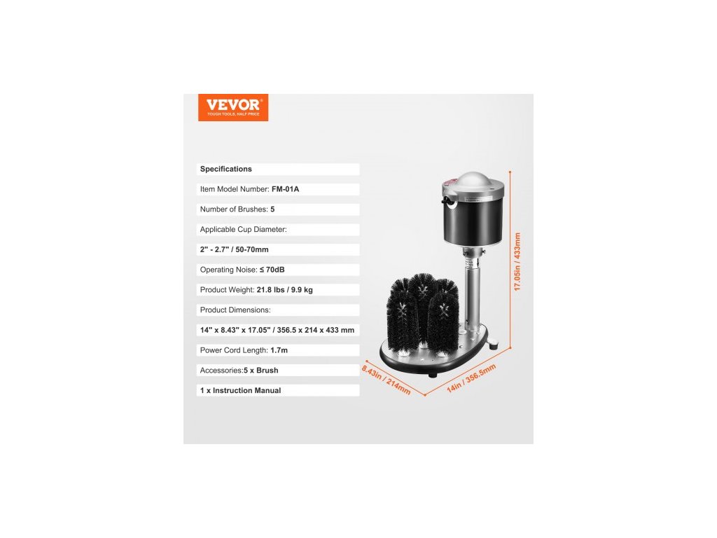 Provozní hluk: ≤ 70 dB,Použitelný průměr kelímků: 2" - 2,7" / 50-70 mm,Číslo modelu: FM-01A,Hmotnost výrobku: 21,8 lbs / 9,9 kg,Počet kartáčů: 5,Rozměry výrobku: 14" x 8,43" x 17,05" / 356,5 x 214 x 433 mm