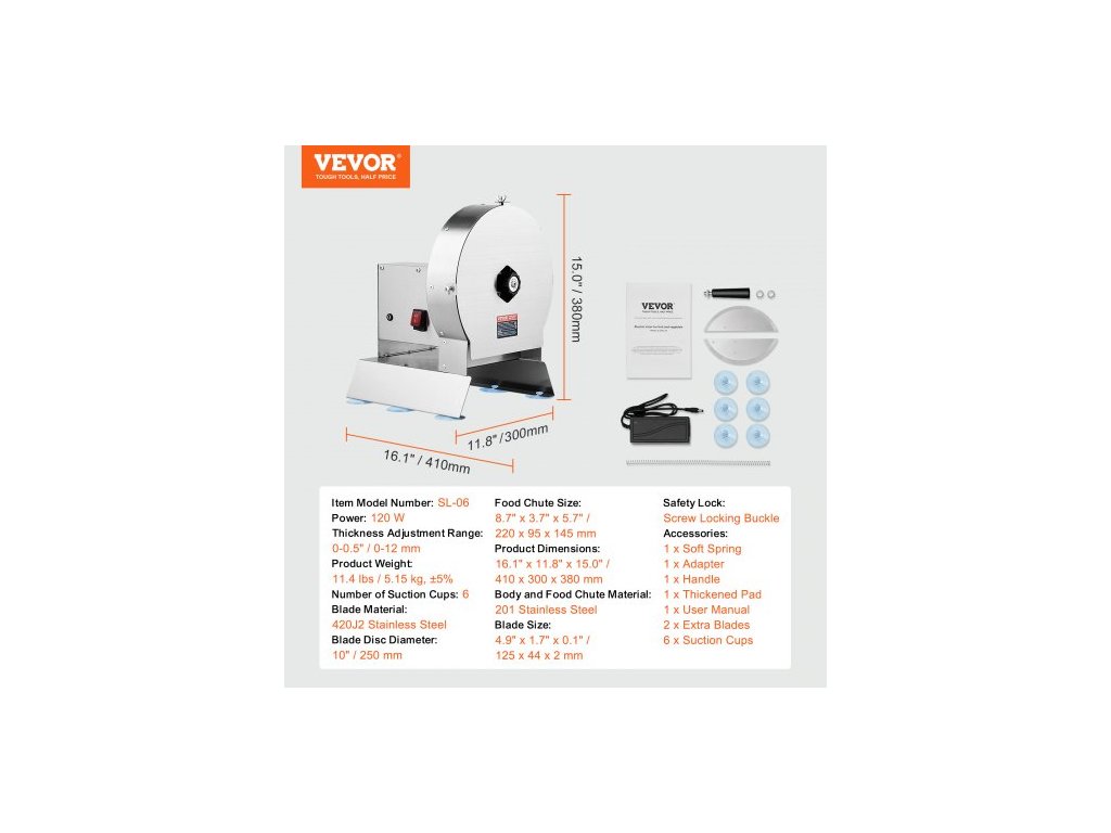 Materiál těla: nerezová ocel 201, rozsah nastavení tloušťky: 0-0,5" / 0-12 mm, číslo modelu: SL-06, velikost násypky na potraviny: 8,7" x 3,7" x 5,7" / 220 x 95 x 145 mm, hmotnost výrobku: 11,4 lbs / 5,15 kg, ±5%, počet přísavek: 6, rozměry výrobku: 16,1" x 11,8" x 15,0" / 410 x 300 x 380 mm, Výkon: 120 W