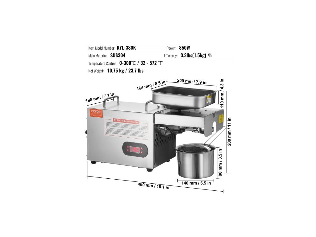 Ovládání teploty: 0-300℃ / 32 - 572 ℉,Účinnost: 3,3 libry (1,5 kg) /h,Číslo modelu položky: KYL-380K,Čistá hmotnost: 10,75 kg / 23,7 libry,Příkon: 850W,Hlavní materiál: SUS304