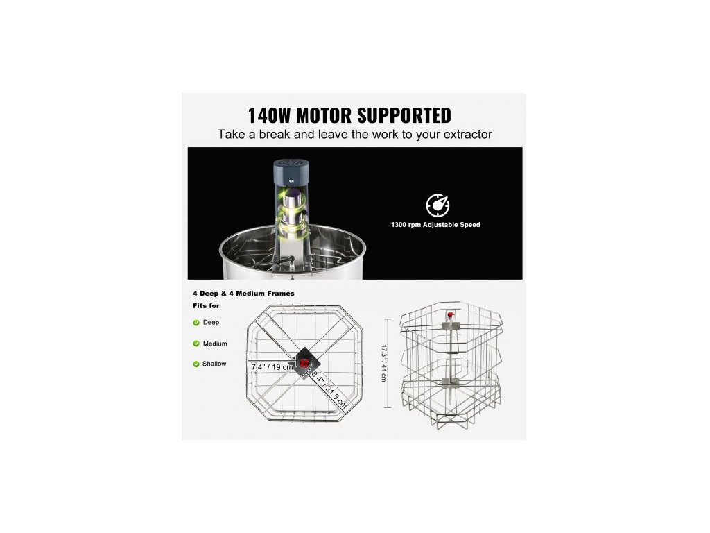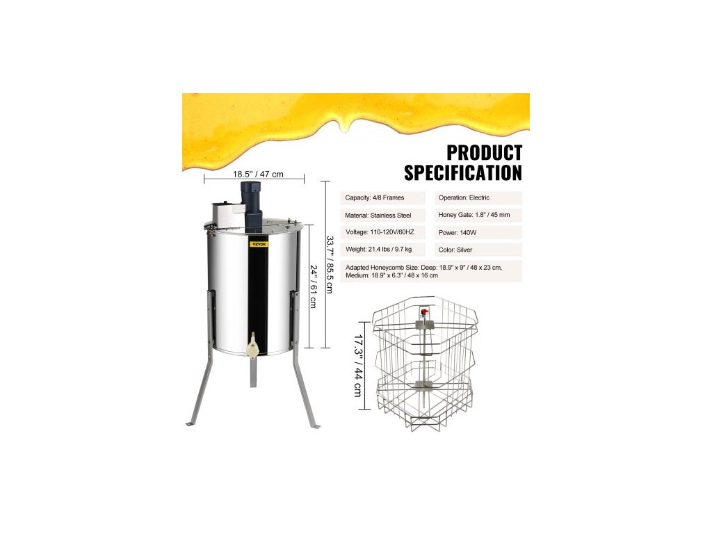 Přizpůsobená velikost plástve: Hloubka: 48 x 23 cm, Střední: 48 x 16 cm, Otáčky motoru: 1300 ot/min, Kapacita: 4/8 rámků, Napětí: 110-120V/60HZ, Model: DD-4/8, Hmotnost výrobku: 17,8 kg, Medová brána: 45 mm, Materiál: Nerezová ocel, Provoz: Elektrický, Příkon: 140 W