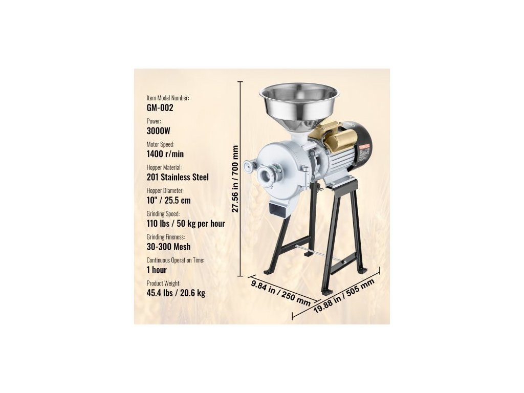 Otáčky motoru: 1400 ot/min,Rozměry výrobku (D x Š x V): 505 x 250 x 700 mm,Materiál násypky: nerezová ocel 201,Průměr násypky: 25,5 cm,Rychlost mletí: 50 kg za hodinu,Číslo modelu položky: GM-002,Hmotnost výrobku: 20,6 kg,Kontinuální Doba provozu: 1 hodina, Jemnost mletí: 30-300 mesh, Výkon: 3000 W