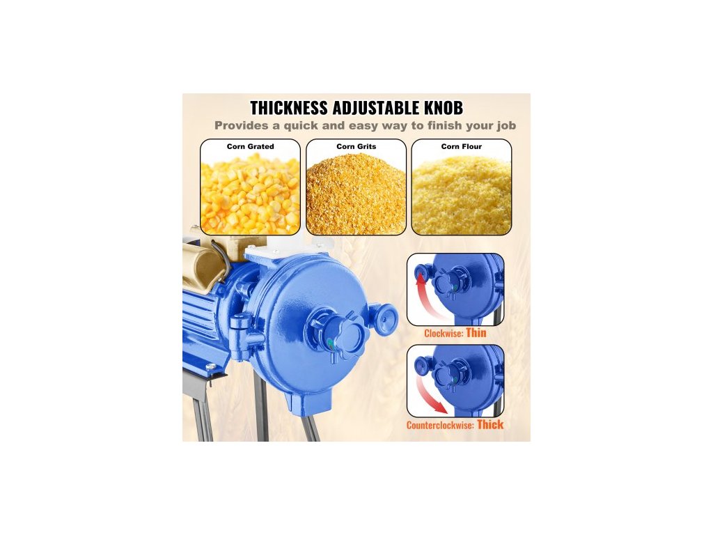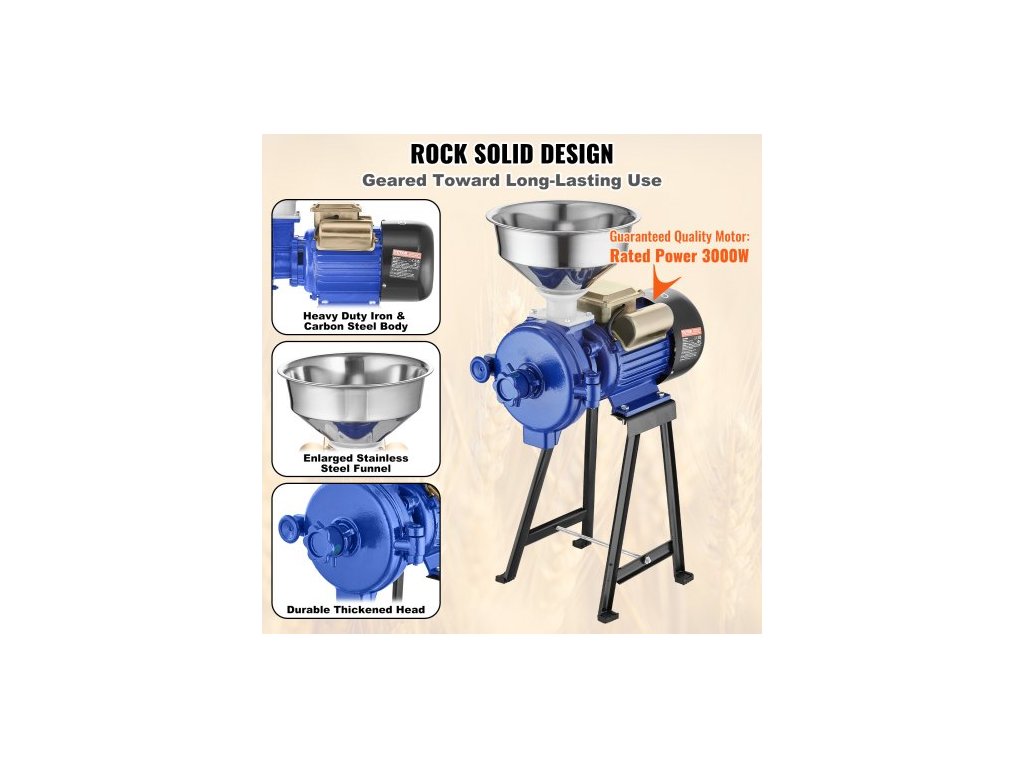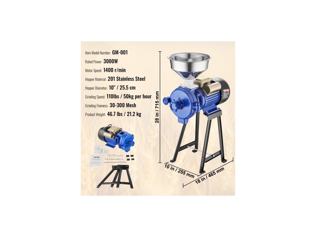 Otáčky motoru: 1400 ot/min,Rozměry výrobku (D x Š x V): 465 x 255 x 715 mm,Materiál násypky: nerezová ocel 201,Průměr násypky: 25,5 cm,Rychlost mletí: 50 kg za hodinu,Číslo modelu položky: GM-001,Hmotnost výrobku: 21,2 kg,Doba nepřetržitého provozu: 1 hodina,Mletí Jemnost: 30-300 mesh, výkon: 3000 W
