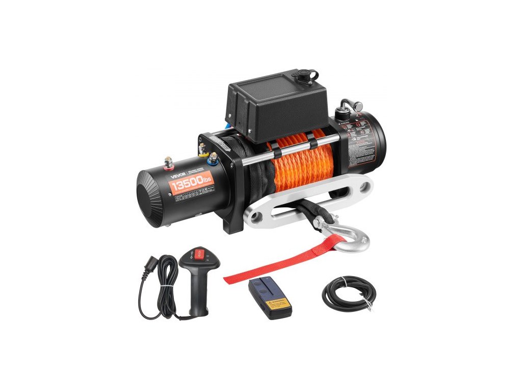 Vodotěsnost: IP55, Dálkové ovládání: Bezdrátové + kabelové dálkové ovládání, Materiál lana: Polyethylen, 12 pramenů, Číslo modelu položky: SC13000, Napětí/výkon: 12 V DC/6,6 HP, Převodový poměr: 195,8:1, Rozměry položky: 21,1 x 6,3 x 8,6 palce/53,7 x 16 x 21,8 cm, Jmenovitá tažná síla: 13500 lbs/6123 kg, Specifikace lana: Φ3/8 palce x 80 stop/Φ1,0 x 2438,4 cm, Čistá hmotnost: 50,4 lbs/22,84 kg, Hlavní materiál: Slitina hliníku, oceli, mědi, plastu (PPS a PA atd.), Dosah bezdrátového dálkového ovládání: 65,61 ft/20 m