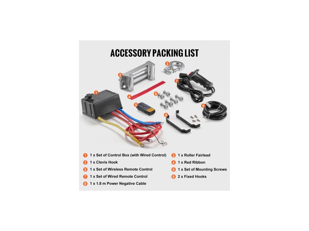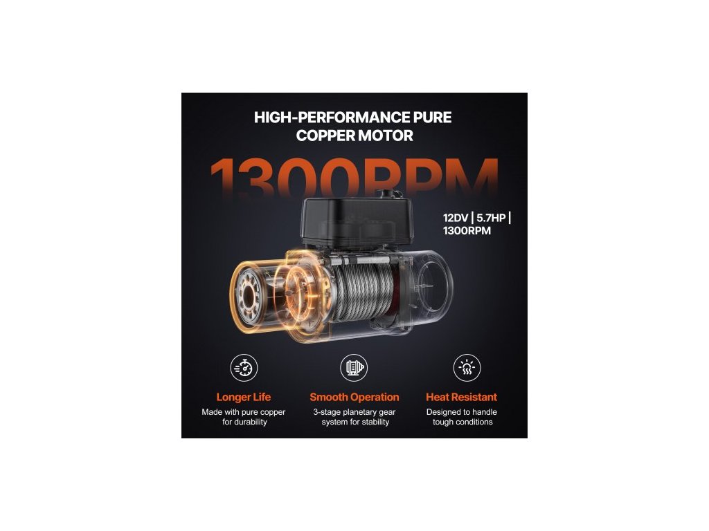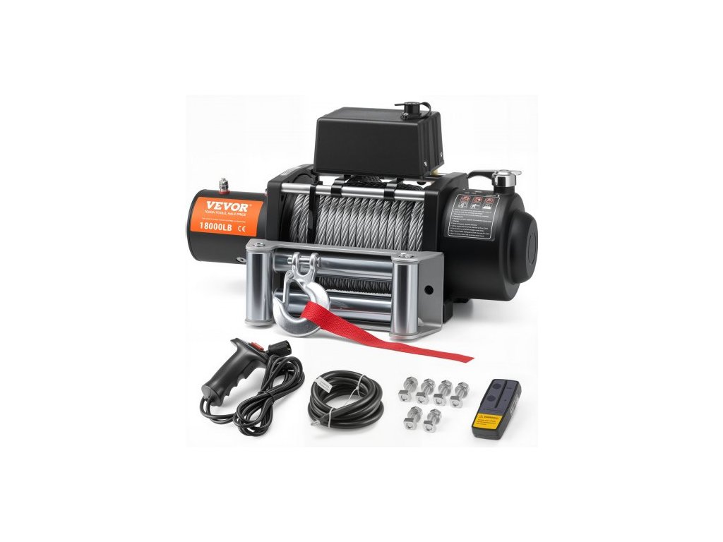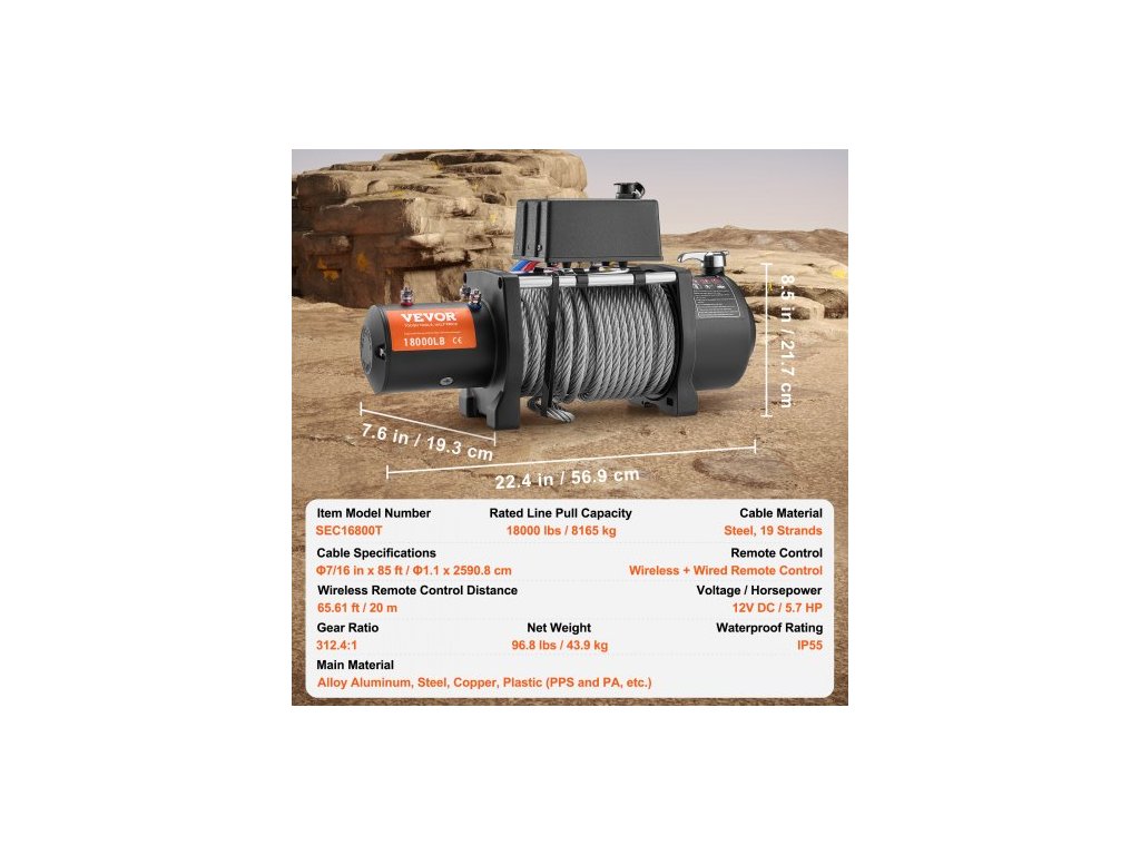 Elektrický naviják pro nákladní automobily, ocelové lano, vodotěsné dálkové ovládání IP65, elektrický naviják pro nákladní automobily, výkonný pohonný systém, bezpečné a spolehlivé tažení, odolný kabel, barevně odlišené napájecí kabely, všestranné použití, stupeň vodotěsnosti: IP55, dálkové ovládání: bezdrátové + kabelové dálkové ovládání, číslo modelu: SEC16800T, napětí/výkon: 12 V DC/5,7 HP, materiál kabelu: ocel, 19 pramenů, specifikace kabelu: Φ7/16 palců x 85 stop/Φ1,1 x 2590,8 cm, převodový poměr: 312,4:1, rozměry: 22,4 x 7,6 x 8,5 palců/56,9 x 19,3 x 21,7 cm, jmenovitá tažná síla: 18000 8165 kg, Čistá hmotnost: 43,9 kg, Hlavní materiál: Slitina hliníku, oceli, mědi, plastu (PPS a PA atd.), Dosah bezdrátového dálkového ovládání: 20 mDoplňkové parametry