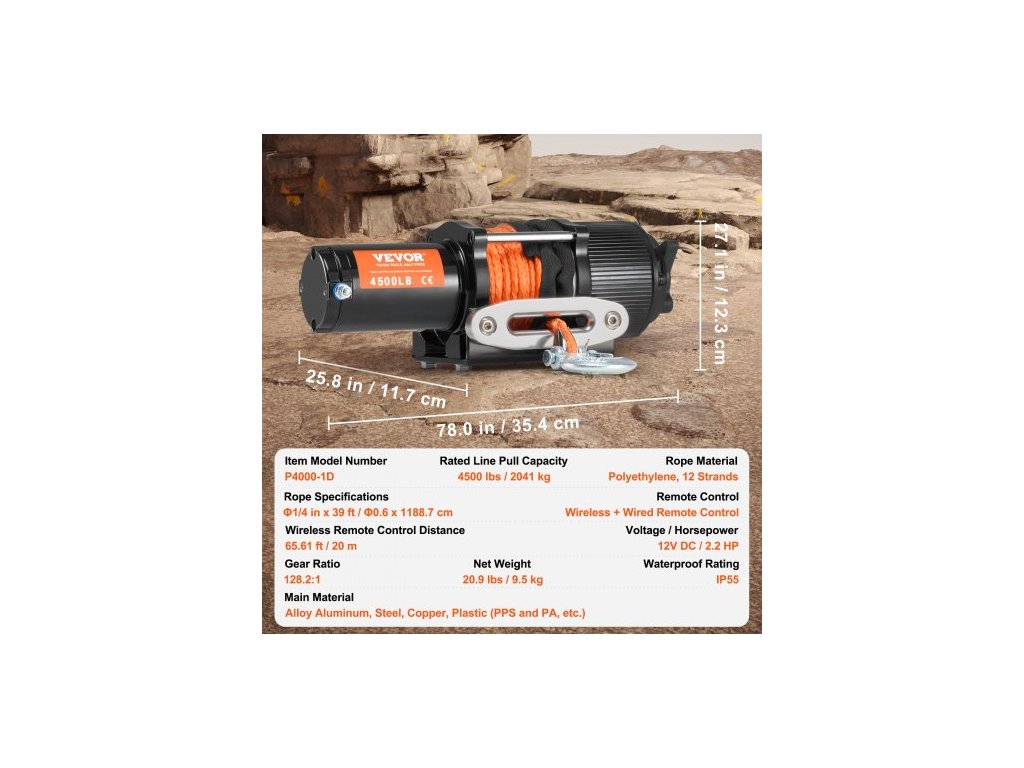 Stupeň vodotěsnosti: IP55,Dálkové ovládání: Bezdrátové + kabelové dálkové ovládání,Materiál lana: Polyethylen, 12 pramenů,Číslo modelu položky: P4000-1D,Napětí/výkon: 12 V DC/2,2 HP,Převodový poměr: 128,2:1,Rozměry položky: 13,9 x 4,6 x 4,8 palce/35,4 x 11,7 x 12,3 cm,Jmenovitá tažná síla: 4500 lbs/2041 kg,Specifikace lana: Φ1/4 palce x 39 stop /Φ0,6 x 1188,7 cm, Čistá hmotnost: 9,5 kg, Hlavní materiál: Slitina hliníku, oceli, mědi, plastu (PPS a PA atd.), Dosah bezdrátového dálkového ovládání: 20 m