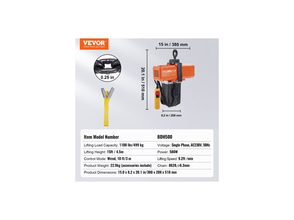 Napětí/frekvence: Jednofázové, AC230V, 50Hz,Maximální výška zdvihu: 4,5 m,Specifikace dálkového ovládání: Drátové, 3 m,Číslo modelu položky: BDH500,Hmotnost výrobku: 22,934 kg,Příkon: 580 W,Materiál řetězu:Legovaná ocel 8620 (G100),Nosnost: 499 kg,Průměr lanka řetězu: 6,3 mm,Rozměry výrobku: 15,0 x 8,2 x 20,1 palce / 380 × 208 × 510 mm