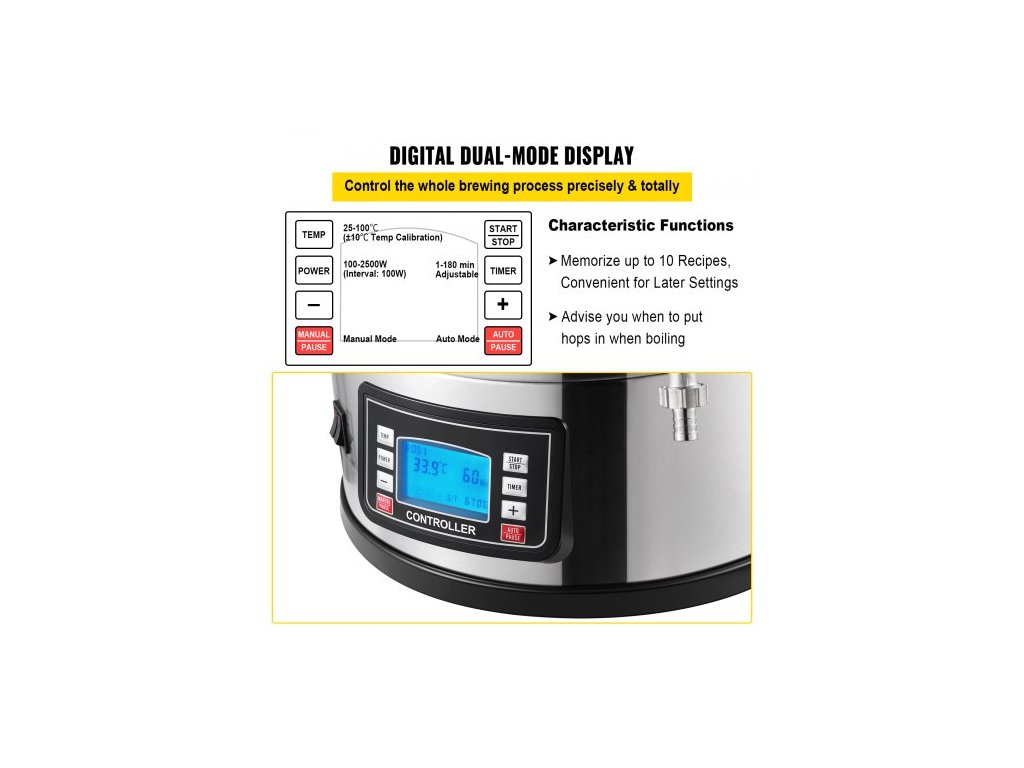 Elektrický varný systém , 8 galonů/30 l, domácí varný automat s automatickým/manuálním režimem, zařízení na vaření sladu s výkonem 100–2500 W, teplotou 25–100 °C, časovačem 1–180 min, oběhovým čerpadlem, pamětí receptů, 2rozsáhlá varná kapacita