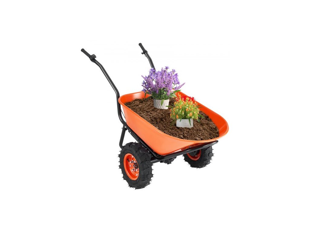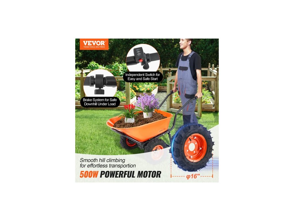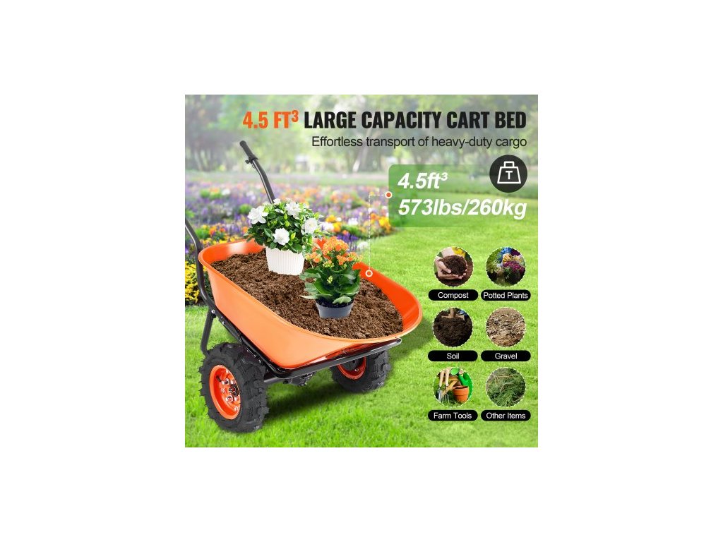Elektrický trakař , zahradní vozík s pohonem 500 W, objem 7 kubických stop. Nosnost a nosnost 573 liber s kovovou rukojetí a 16" kolečky, dvoukolový vozík a vozy pro zahradní farmuZahradní pomocník