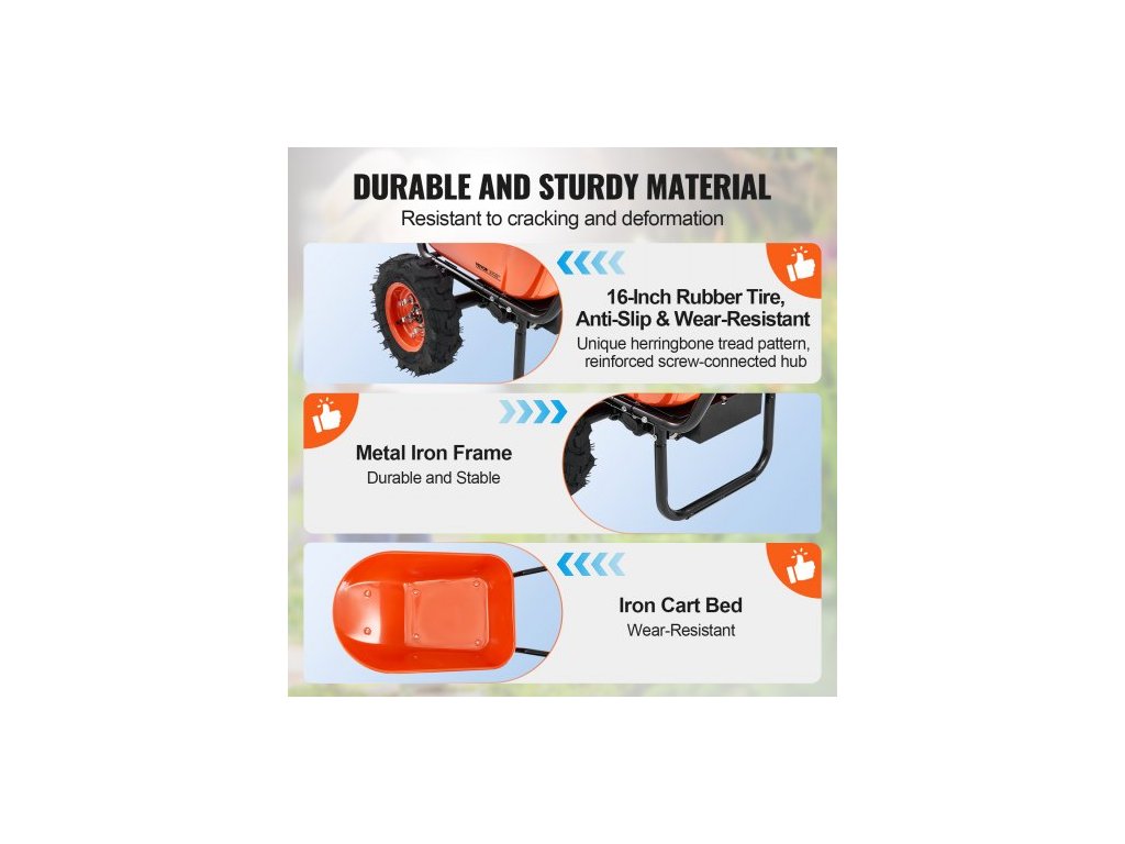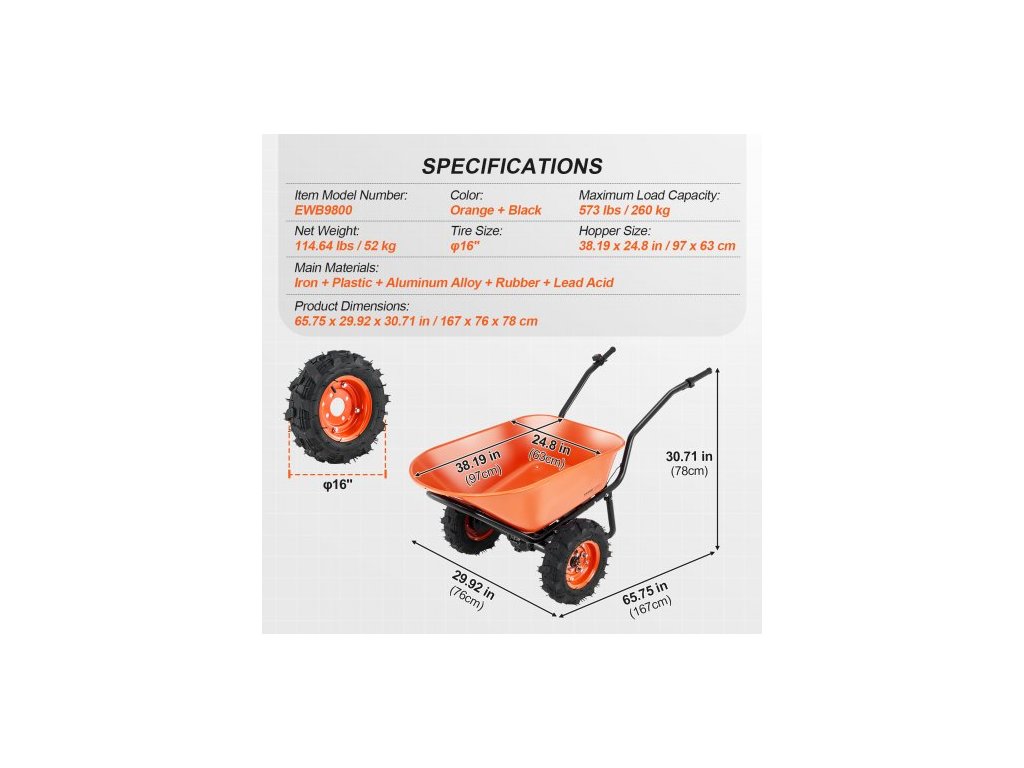 Rozměr pneumatik: φ16x4", Hlavní materiály: Železo + plast + hliníková slitina + guma + olověný benzín, Barva: oranžová + černá, Číslo modelu položky: EWB9800, Maximální nosnost: 573 liber / 260 kg, Rozměry korby vozíku: 38,19 x 24,8 palce / 97 x 63 cm, Rozměry výrobku: 65,75 x 29,92 x 30,71 palce / 167 x 76 x 78 cm, Čistá hmotnost: 114,64 liber / 52 kg