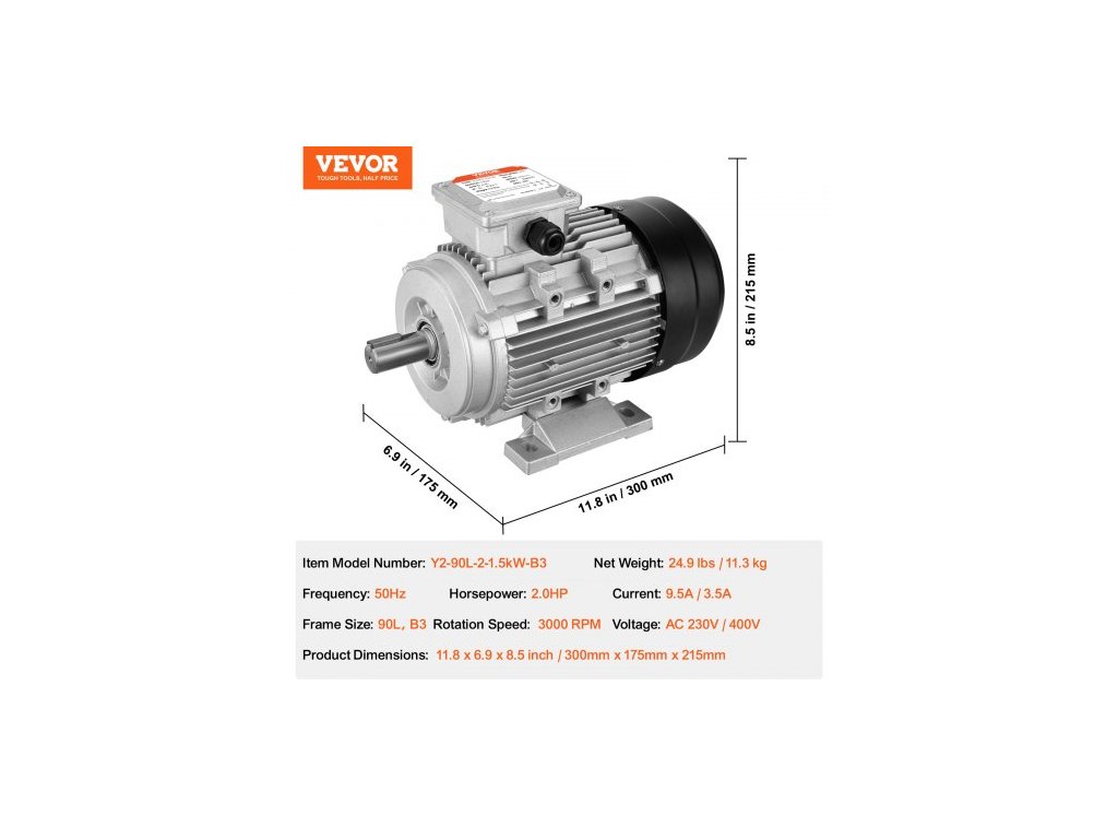 Napětí: AC 230 V/400 V 3fázové,Číslo modelu položky: Y2-90L-2-1,5 kW-B3,Frekvence: 50 Hz,Rozměry výrobku: 11,8 x 6,9 x 8,5 palce / 300 x 175 x 215 mm,Proud: 9,5 A/3,5 A,Čistá hmotnost: 24,9 lbs / 11,3 kg, Výkon: 1,5 kW / 2 HP, Velikost rámu: 90 l, B3, Rychlost otáčení: 3000 ot./min.