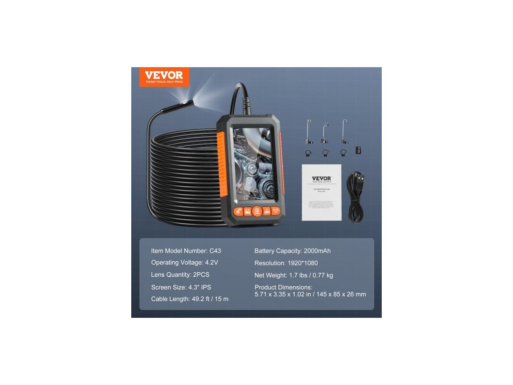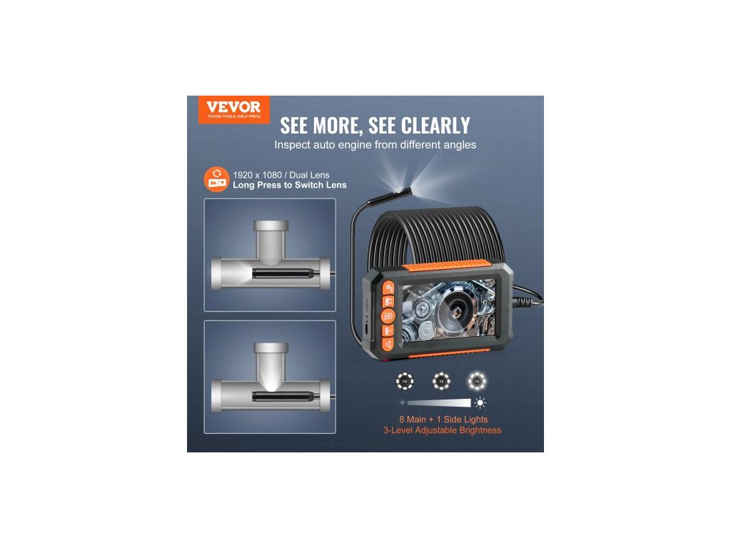 Endoskopická kamera s osvětlením, boroskop s dvojitým objektivem, kabel 1499,6 cm, obrazovka 10,9 cmNastavitelná světla