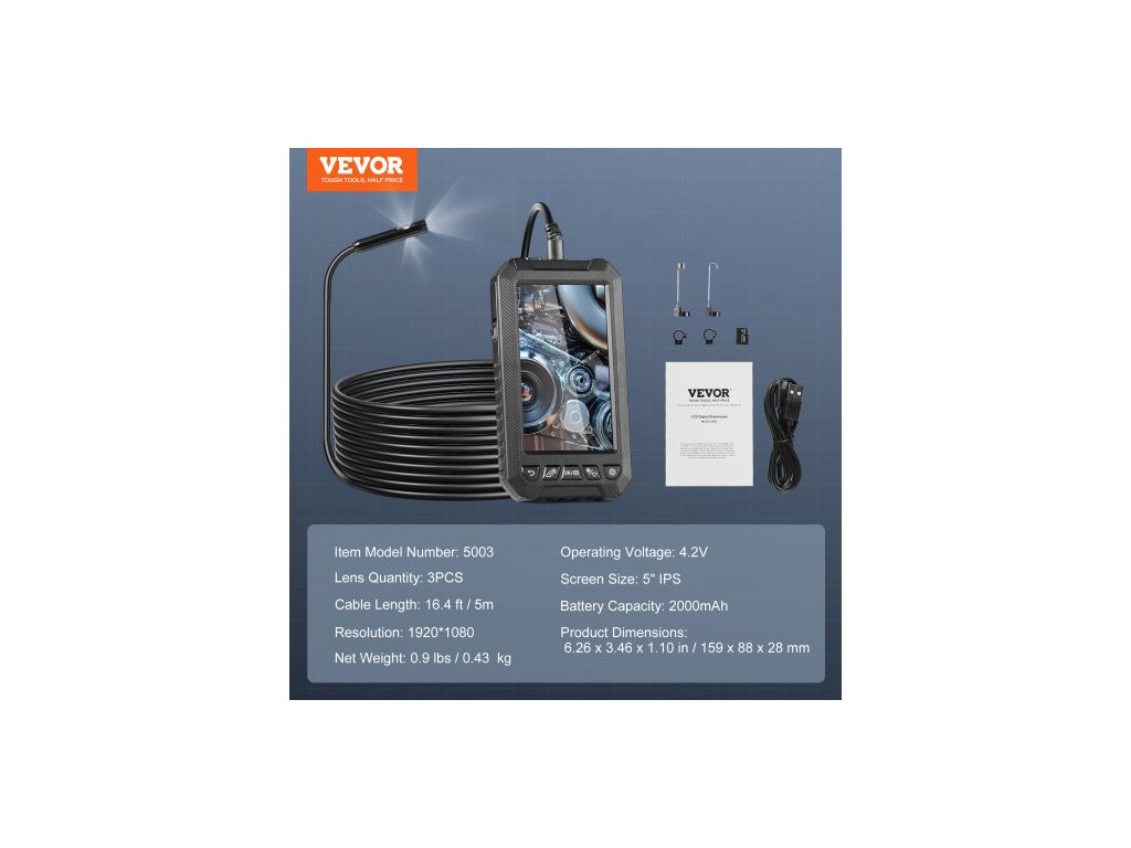 Endoskopická kamera s osvětlením, trojitý objektiv, boroskop, kabel 499,9 cm, obrazovka 12,7 cm, nastavitelná světla, polotuhý a flexibilní kabel, velká 5" IPS obrazovka, pokročilé krystalické rozlišení, široké možnosti použití, 3stupňový zoom, počet objektivů: 3 ks, kapacita baterie: 2000 mAh, velikost obrazovky: 5" IPS, provozní napětí: 4,2 V, číslo modelu: 5003, délka kabelu: 5 m, rozměry produktu: 159 x 88 x 28 mm, čistá hmotnost: 0,43 kg, rozlišení: 1920*1080Doplňkové parametry