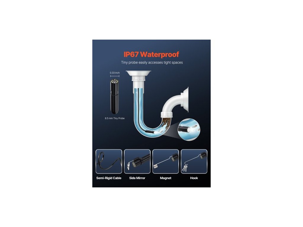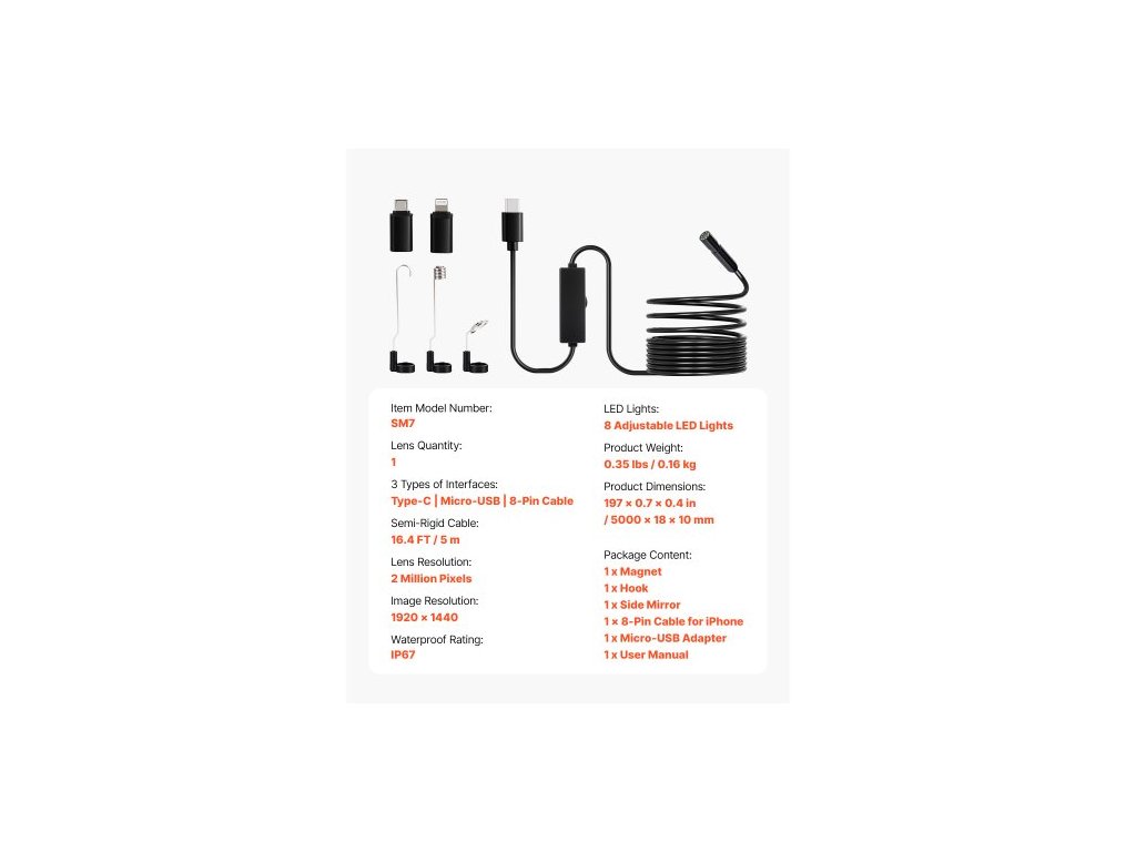 Počet objektivů: 1,Stupeň vodotěsnosti: IP67,Rozlišení obrazu: 1920 x 1440,Polotuhý kabel: 5 m,Číslo modelu položky: SM7,Hmotnost výrobku: 0,16 kg,Rozlišení objektivu: 2 miliony pixelů,Rozměry výrobku: 5000 x 18 x 10 mm,LED světla: 8 nastavitelných LED světel