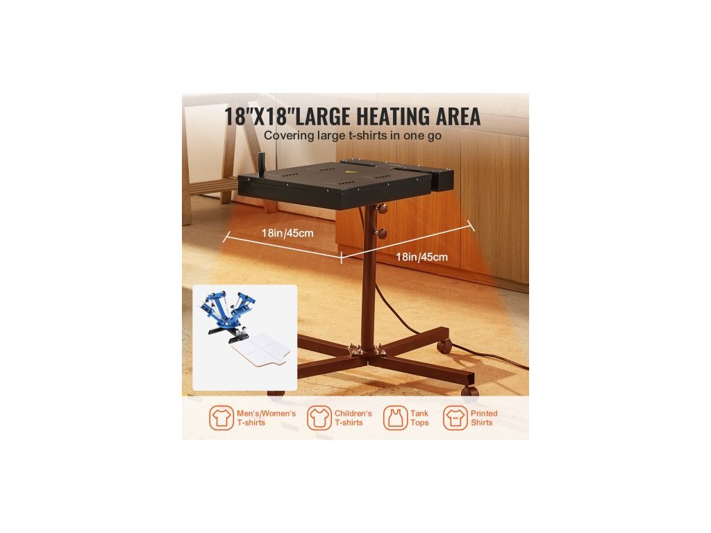 Flash Dryer, blesková sušička 18 x 18 palců pro sítotisk, vysoce výkonná sušička pro sítotisk s výškově nastavitelným stojanem, rotace 360°, základna ve tvaru X, vytvrzovací stroj na ocelová trička