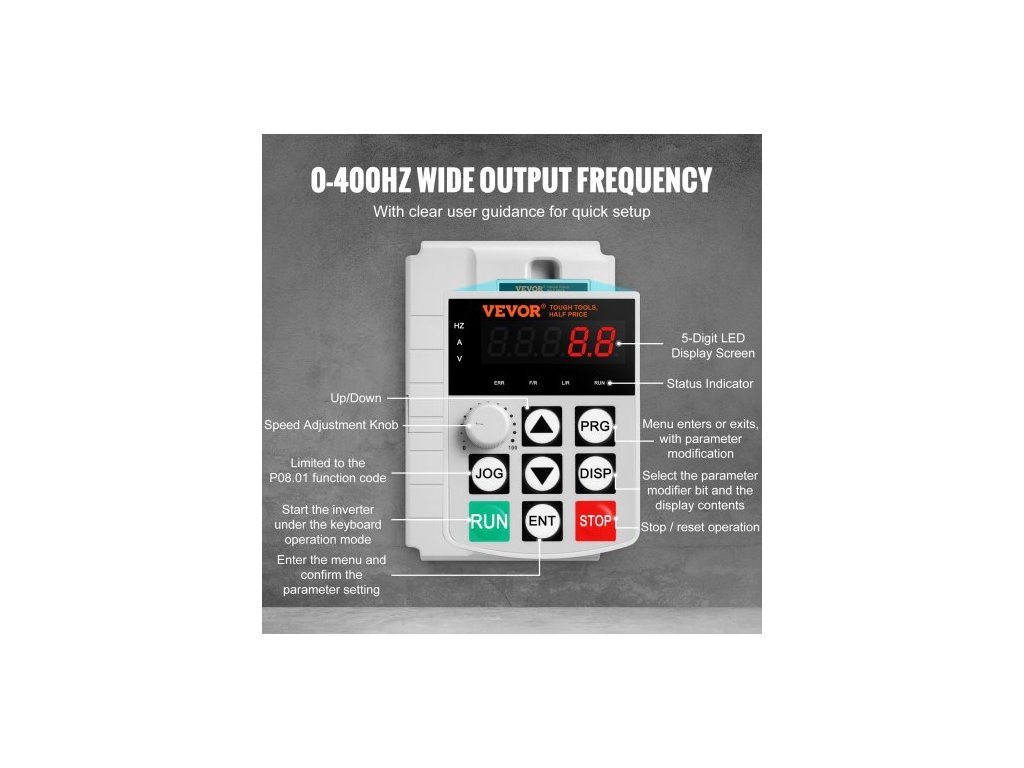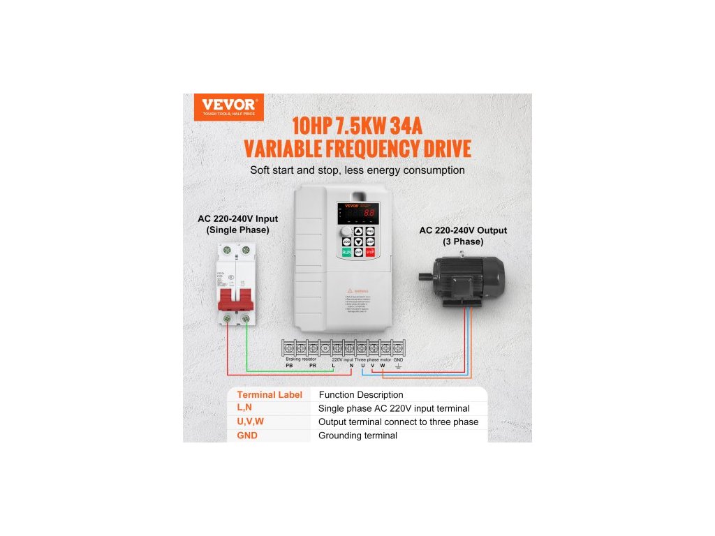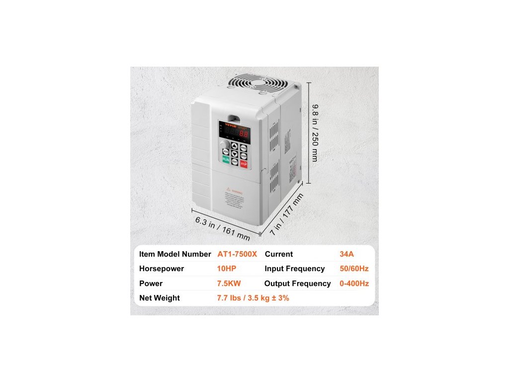 Vstupní frekvence: 50/60 Hz,Provozní teplota: 10 °C-40 °C,Výkon: 10 HP,Číslo modelu položky: AT1-7500X,Vstupní napětí: AC 220-240 V jednofázové,Proud: 34 A,Výstupní napětí: AC 220-240 V třífázové,Čistá hmotnost: 3,5 kg ± 3 %,Výkon: 7,5 kW, výstupní frekvence: 0–400 Hz