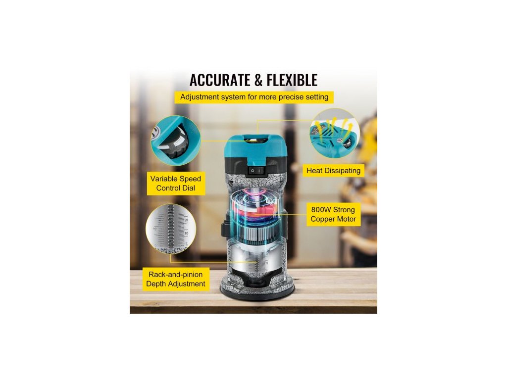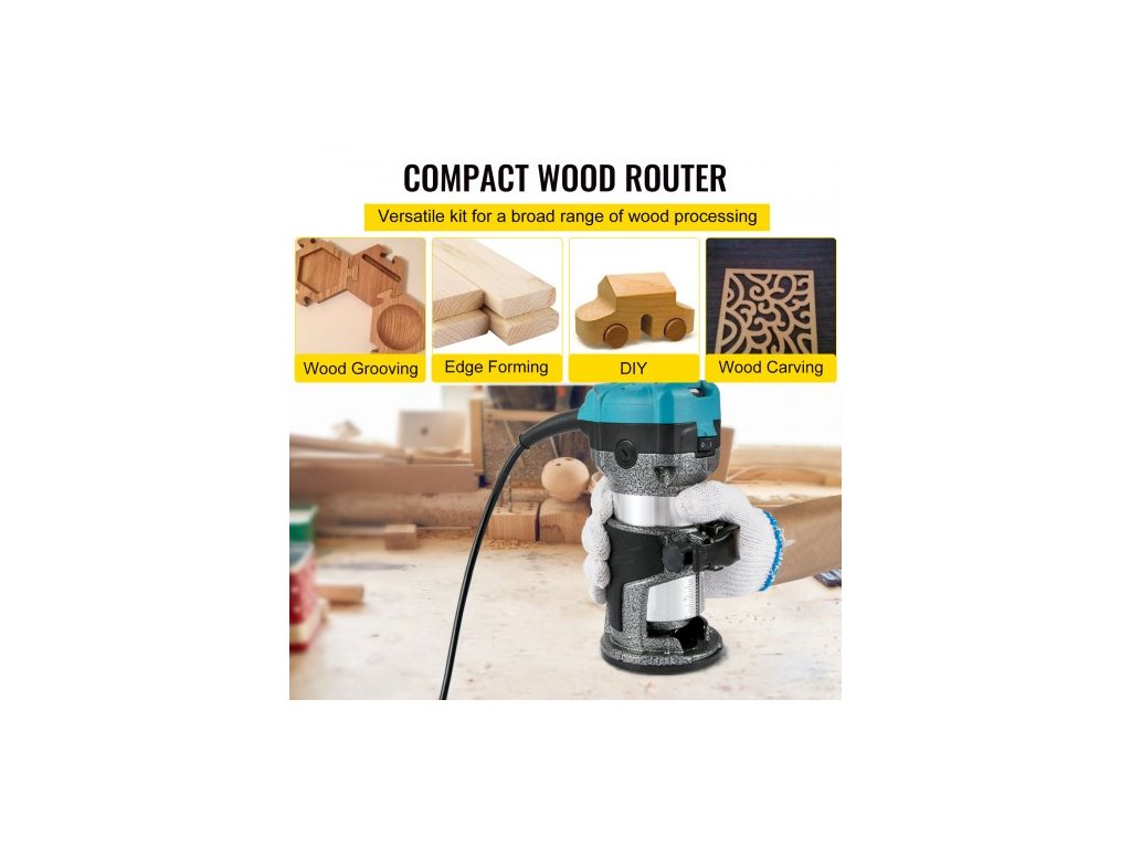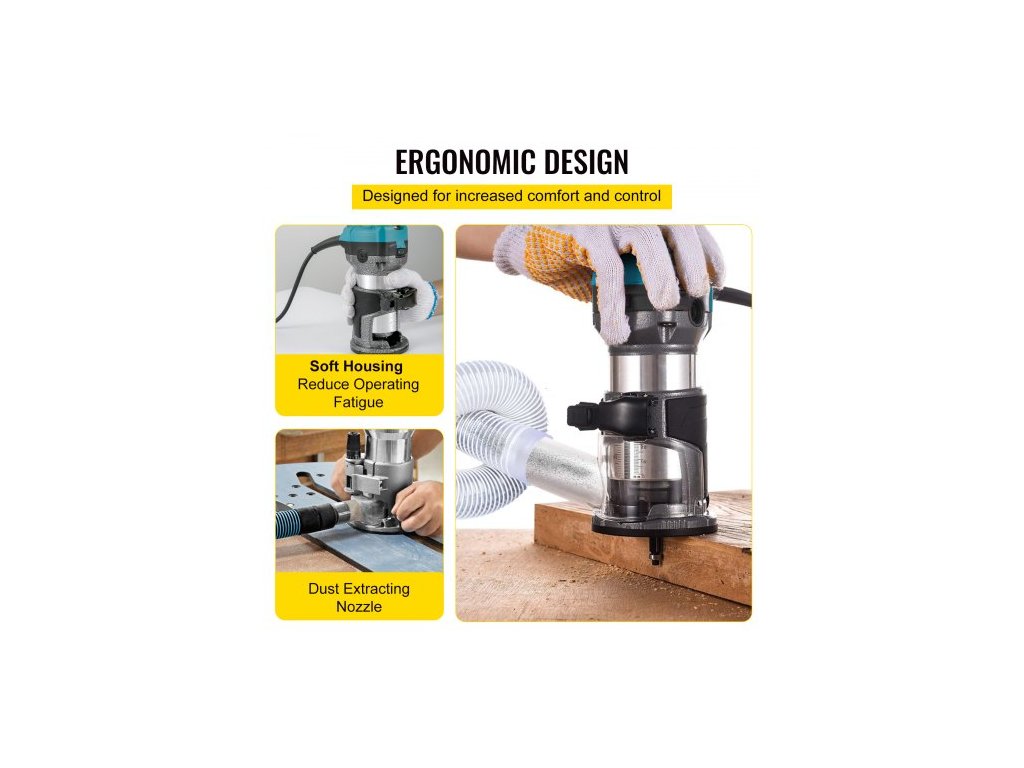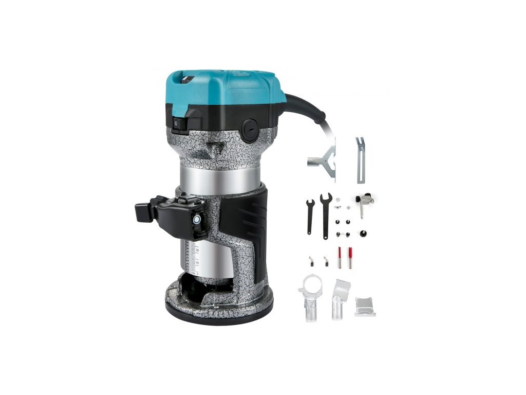 frézka, 710W dřevěná frézka, frézka na dřevo se třemi kleštinami, dřevěná frézka s pevnou základnou, dřevěná frézka s hliníkovým pláštěm a rychlostí otáčení 13000 - 33000 ot./minKompaktní dřevěná frézka