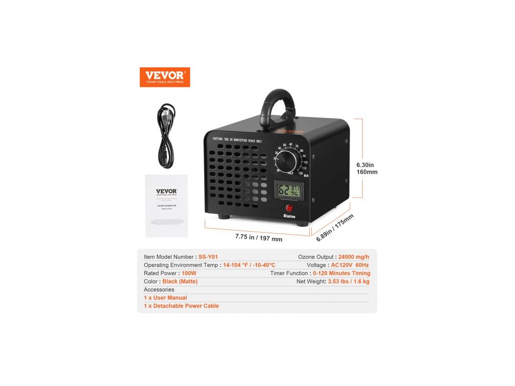 Výstup ozonu: 24000 mg/h,Napětí: AC220–240 V 50 Hz,Číslo modelu položky: SS-Y01,Jmenovitý výkon: 100 W,Rozměry výrobku: 6,89 x 7,75 x 6,30 palce / 175 x 197 x 160 mm,Čistá hmotnost: 3,64 lbs / 1,65 kg,Funkce časovače: Časování 0–120 minut,Provozní teplota: 14–104 °F / -10–40 ℃