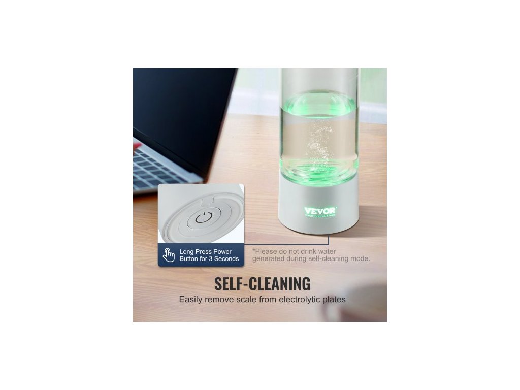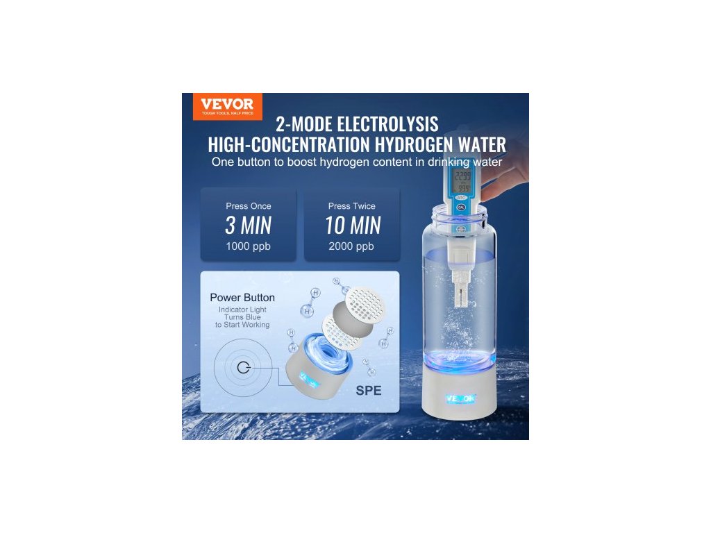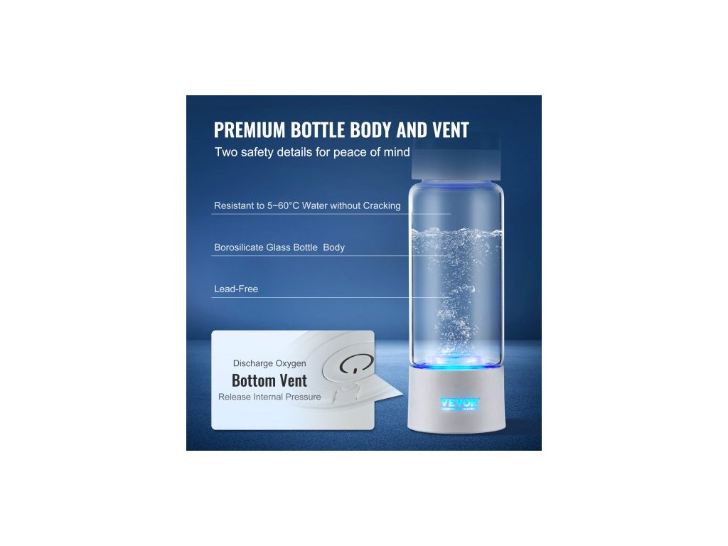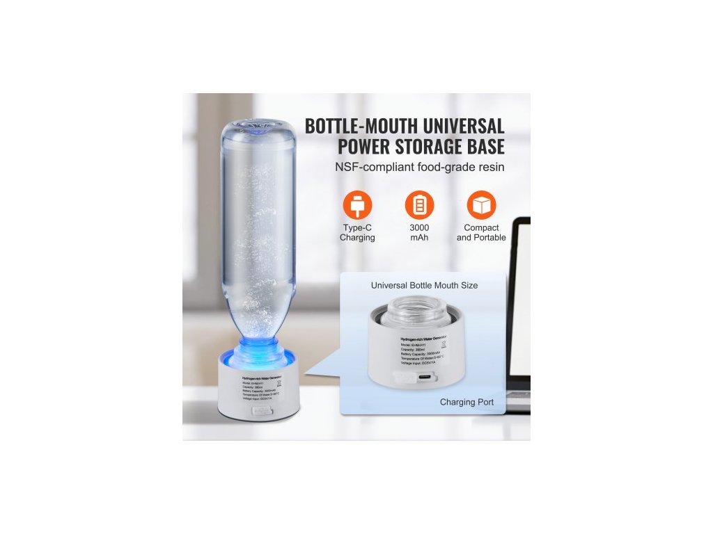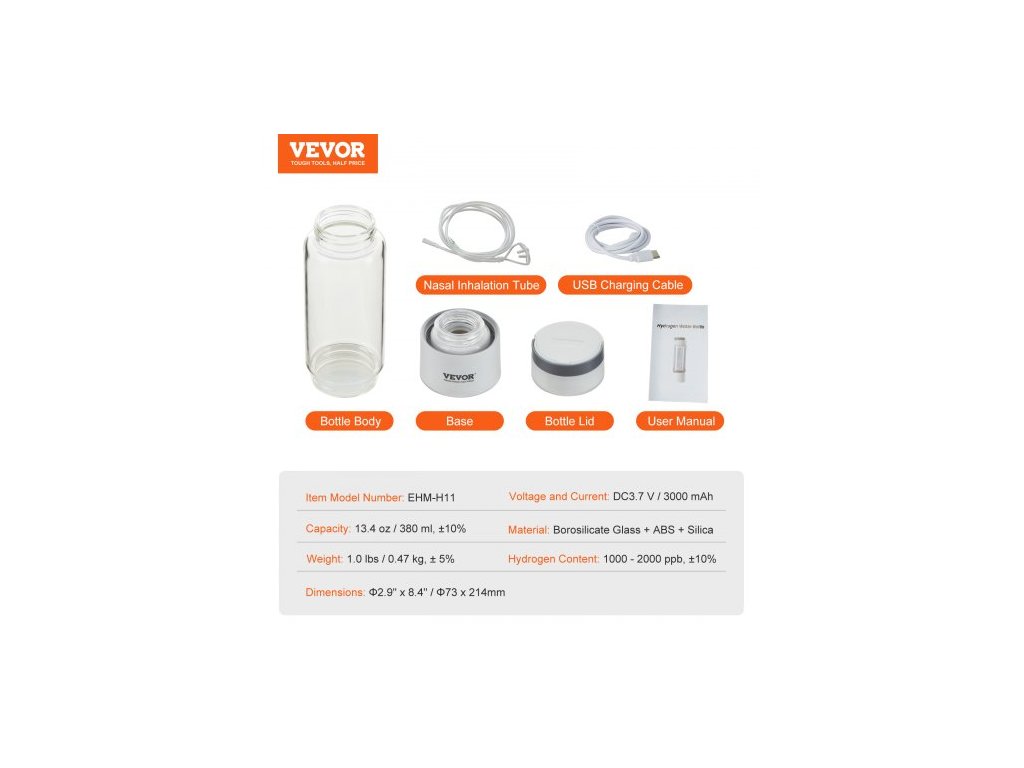 Obsah vodíku: 1000 - 2000 ppb, ±10 %,Kapacita: 13,4 oz / 380 ml, ±10 %,Číslo modelu položky: EHM-H11,Rozměry: Φ2,9" x 8,4" / Φ73 x 214 mm,Materiál: Borosilikátové sklo + ABS + oxid křemičitý,Hmotnost: 1,0 lbs / 0,47 kg, ± 5 %,Napětí a proud: DC 3,7 V / 3000 mAh