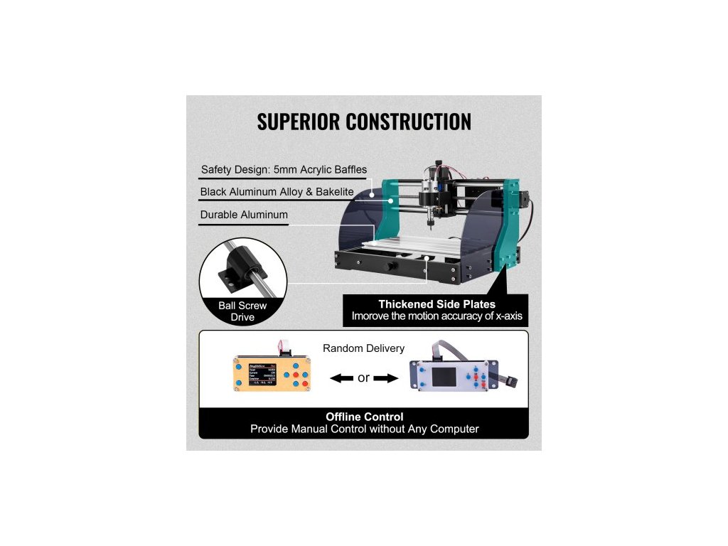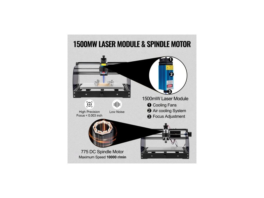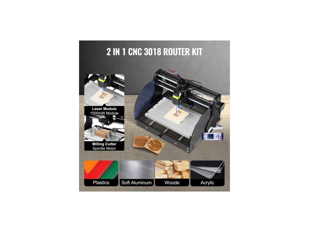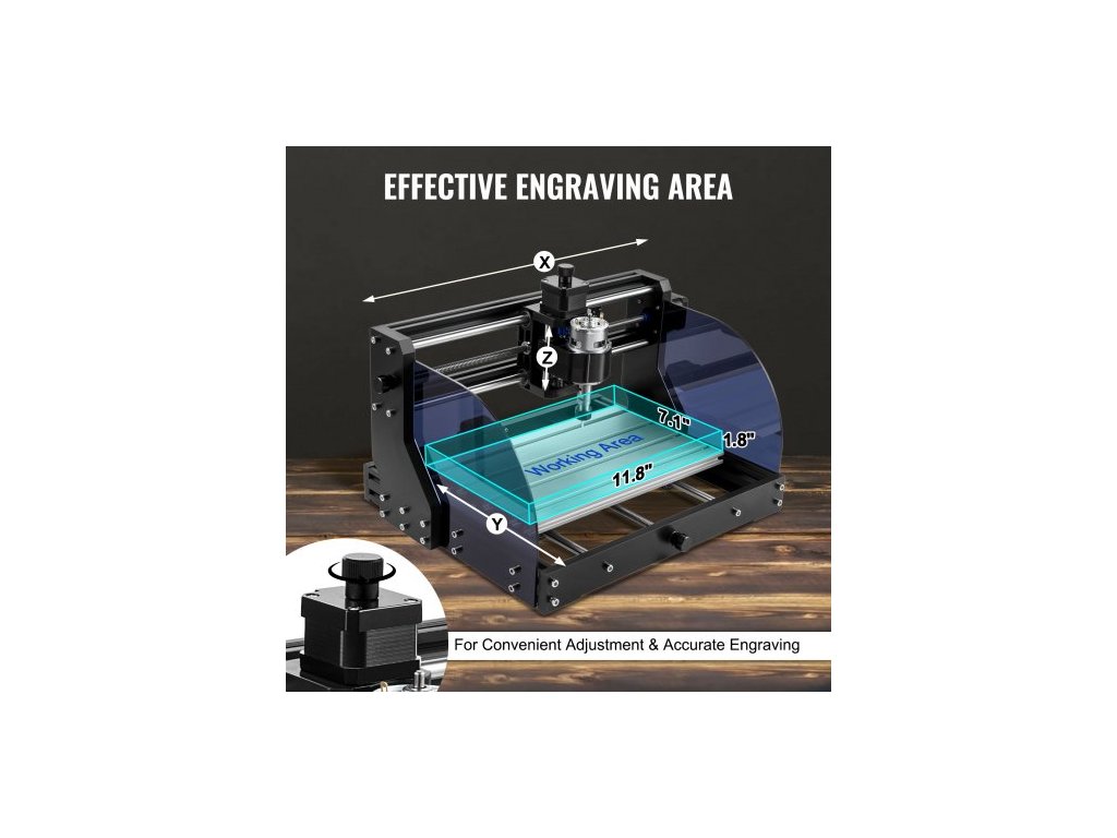 Řídicí software: GRBL Control,Otáčky vřetena: 10000 ot/min,Efektivní pracovní plocha (X x Y x Z): 11,8" x 7,1" x 1,8" / 300 x 180 x 45 mm,Vstupní napájení: DC 24V 5A,Průměr frézy: 0,125" / 3,175 mm,Rozměry položky: 15,7" x 11,8" x 9,4" / 400 x 300 x 240 mm,Materiály: Hliníkový profil a bakelit,Pohonné jednotky: Šrouby z nerezové oceli T8,Model: VG-S3018 Pro MAX,Krokový motor: Velikost 42, 12 V; Točivý moment: 0,25 N/m,Přesnost polohování: 0,003"-0,004" / 0,08-0,1 mm