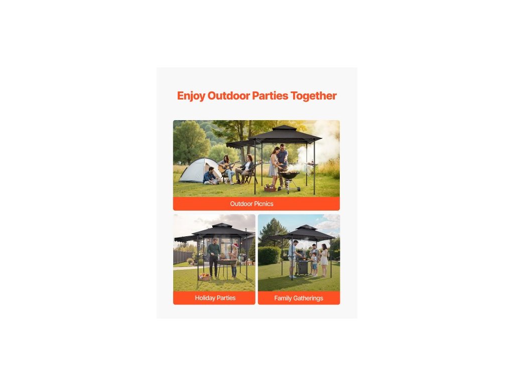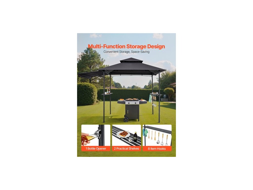 Grill Gazebo, 2,43 x 1,5 m Dvoupatrová střecha, BBQ altán s extra markýzou, práškově lakovaný ocelový přístřešek na terasu s 2 bočními policemi, otvírák na lahve a háčky, venkovní grilovací stříška do zahradyKovový BBQ altán
