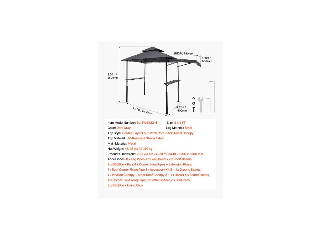 Styl střechy: Dvouvrstvá čtyřpásmová střecha + přídavná stříška,Materiál střechy: UV odolná stínicí látka,Rozměr: 8 x 5 FT,Materiál nohou: Ocel,Barva: Tmavě šedá,Číslo modelu položky: SL-SW5422-4,Rozměry produktu: 95,67 x 59,06 x 98,43 palce / 2430 x 1500 x 2500 mm,Čistá hmotnost: 48,28 lbs / 21,90 kg, Hlavní materiál: Kov