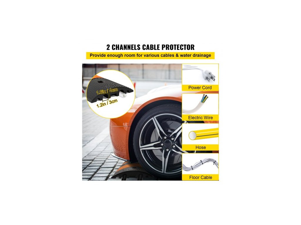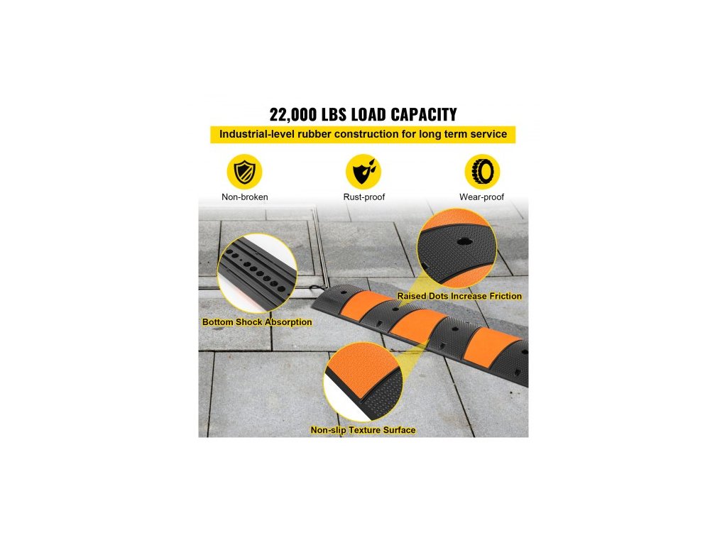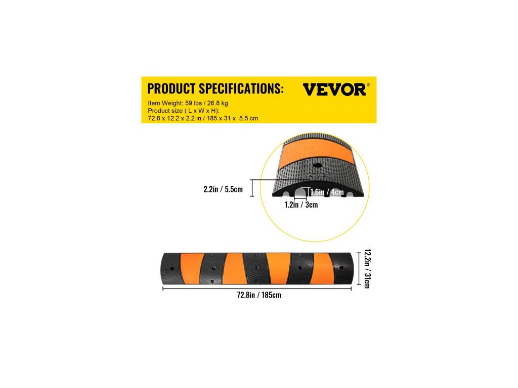 hmotnost položky (každý): 59 liber / 26,8 kg, nosnost: 22 000 liber / 9 980 kg, rozměry jednoho kanálu: 1,2"Š x 1,6"V / 3 x 4 cm, počet kusů: 1 ks, barva: černá + žlutá, kanály: 2, model: VV-GXB-JSD 72YC 1 ks + 2DG, materiál: recyklovaný Guma, rozměry výrobku: 72,8"D x 12,2"Š x 2,2"V / 185 x 31 x 5,5 cm