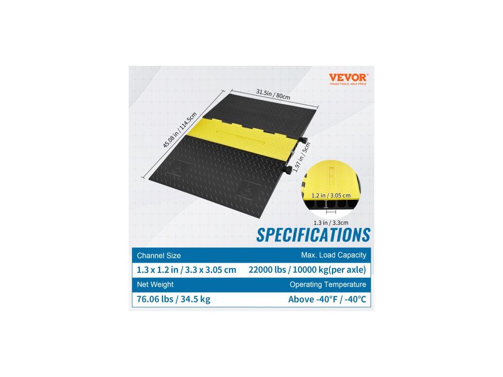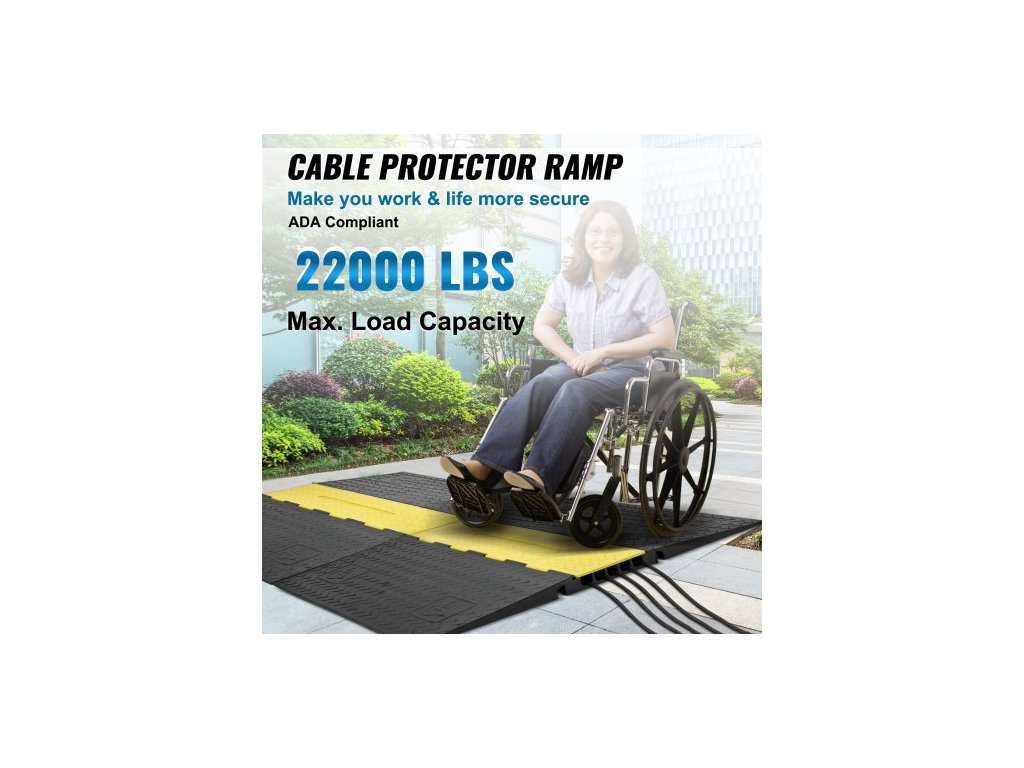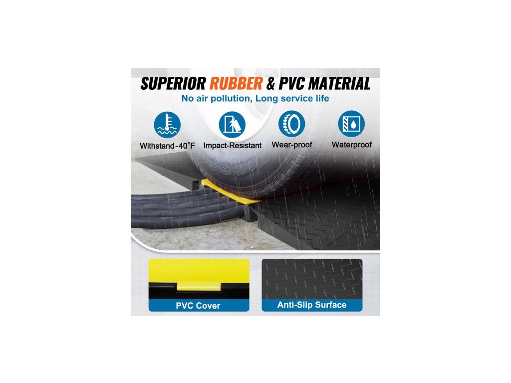 Venkovní kabelová rampa je vyrobena z vysoce kvalitní gumy, která má vynikající odolnost proti opotřebení a korozi. Odolá teplotám -40℉ a 22 000 lbs/nápravu.