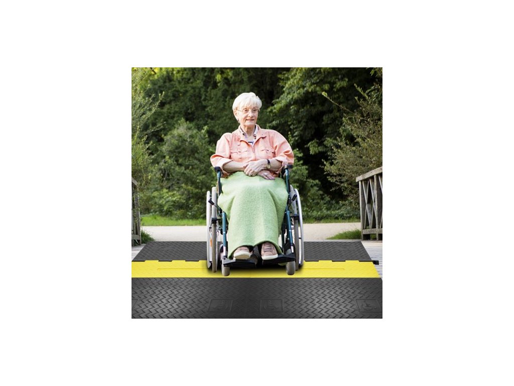 Protiskluzový texturovaný povrch a sklon 26° krytu šňůry rampy zvyšují tření, takže invalidní vozík snadno projede bez klouzání.