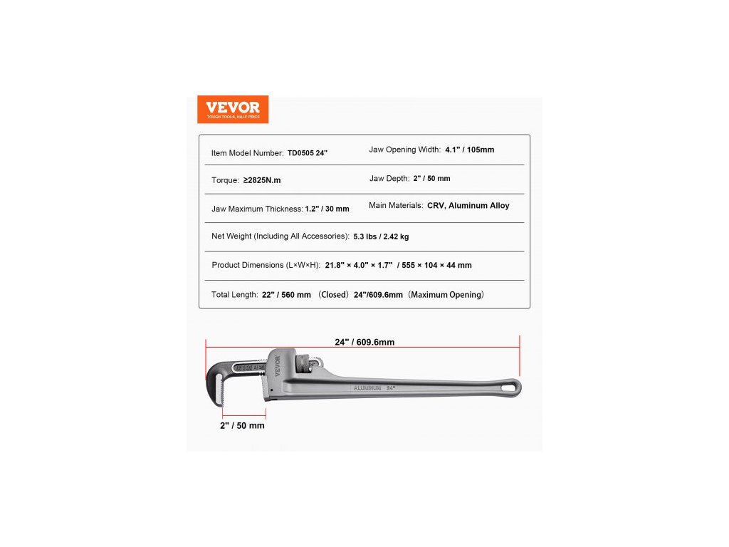 Čistá hmotnost (včetně veškerého příslušenství): 5,3 lbs / 2,42 kg,Točivý moment: ≥2825 N.m,Hlavní materiály: CRV, hliníková slitina,Maximální tloušťka čelisti: 1,2" / 30 mm,Číslo modelu položky: TD0505 24",Hloubka čelisti: 2" / 50 mm,Šířka rozvoru čelisti: 4,1" / 105 mm