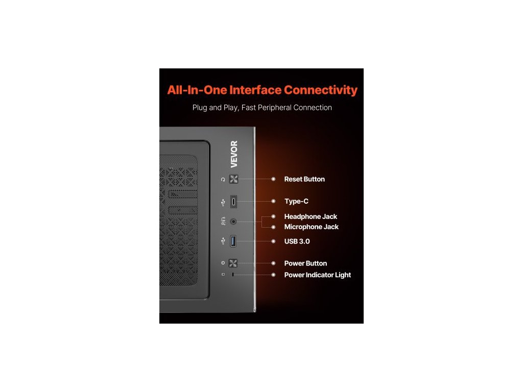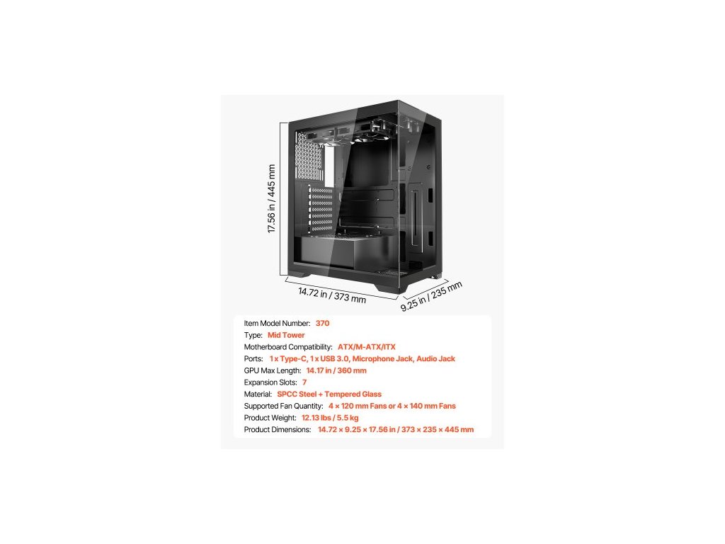 Kompatibilita se základní deskou: ATX/M-ATX/ITX,Typ: Mid Tower,Podporovaný počet ventilátorů: 4 x 120 mm ventilátory, 4 x 140 mm ventilátory,Rozšiřující sloty: 7,Maximální délka GPU: 14,17 palce / 360 mm,Číslo modelu položky: 370,Porty: 1 x Type-C, 1 x USB 3.0,Jack pro mikrofon,Audio jack,Materiál: SPCC ocel + tvrzené Sklo