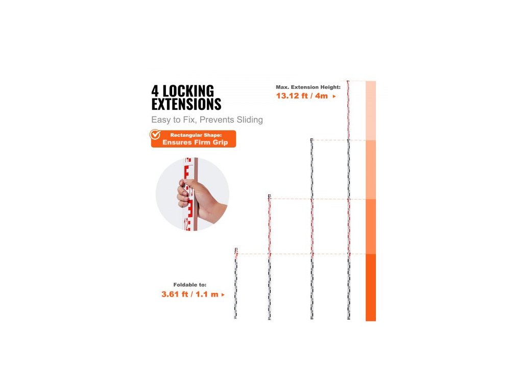 Rozměry výrobku (složený): 46,85x2,24x1,38 palce / 1190x57x35 mm, Dělení: Oboustranné; Přední strana: 1 cm, Zadní strana: 1 mm, Sekce: 4 ks, Barva: Stříbrná, Model: 4M4J, Hmotnost výrobku: 1,24 kg, Rozměry výrobku (v rozloženém stavu): 4000 x 57 x 35 mm, Dosah: 4 m, Hlavní materiál: Hliníková slitina 6063-T5, Tolerance rozsahu: ±1/1000 mm