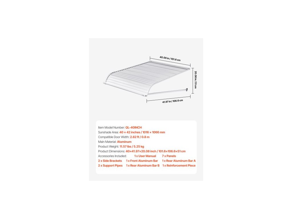 Plocha sluneční clony: 40 × 42 palců (1016 × 1066 mm),Číslo modelu položky: QL-40INCH,Hmotnost výrobku: 10,80 lbs / 4,9 kg,Rozměry výrobku: 40 × 42 palců / 1016 × 1066 mm,Kompatibilní šířka dveří: 2,62 ft / 0,8 m,Hlavní materiál: Hliník