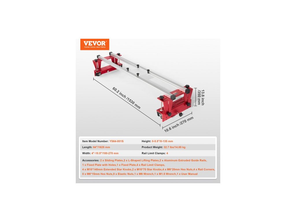 Délka: 64"/1625 mm, Číslo modelu položky: YS64-001S, Hmotnost výrobku: 32,7 lbs/14,85 kg, Počet upínacích lišt: 4, Výška: 0-5,5"/0-135 mm, Materiál: Hliníková slitina 6061, Šířka: 4"-10,5"/100-270 mm