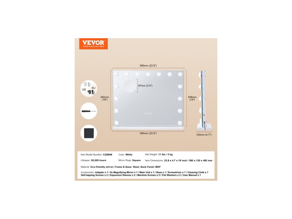 Tvar zrcadla: Čtvercový,Barva: Bílá,Číslo modelu položky: CQ5846,Rozměry položky: 22,8 x 4,7 x 19 palců / 580 x 120 x 482 mm,Materiál: Ekologické zrcadlo; Rám a podstavec: Ocel; Zadní panel: MDF,Čistá hmotnost: 11 lbs / 5 kg,Životnost: 50 000 hodin