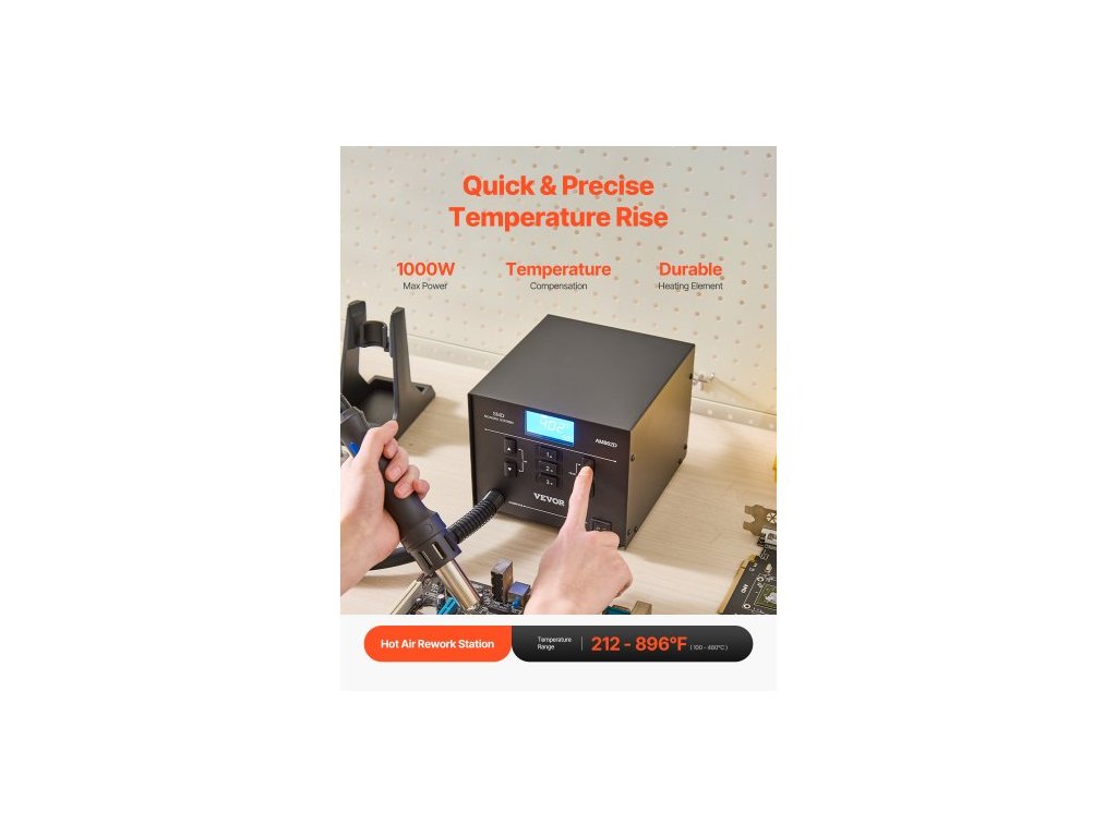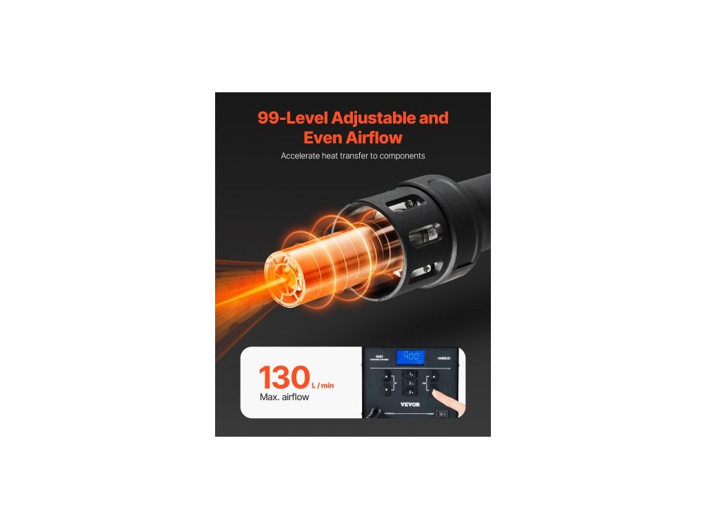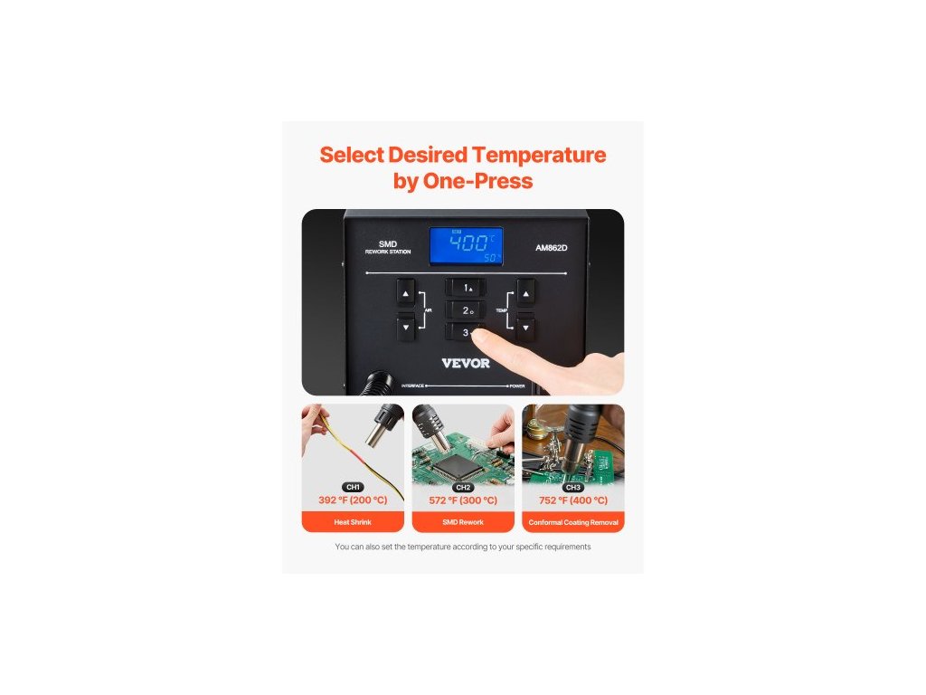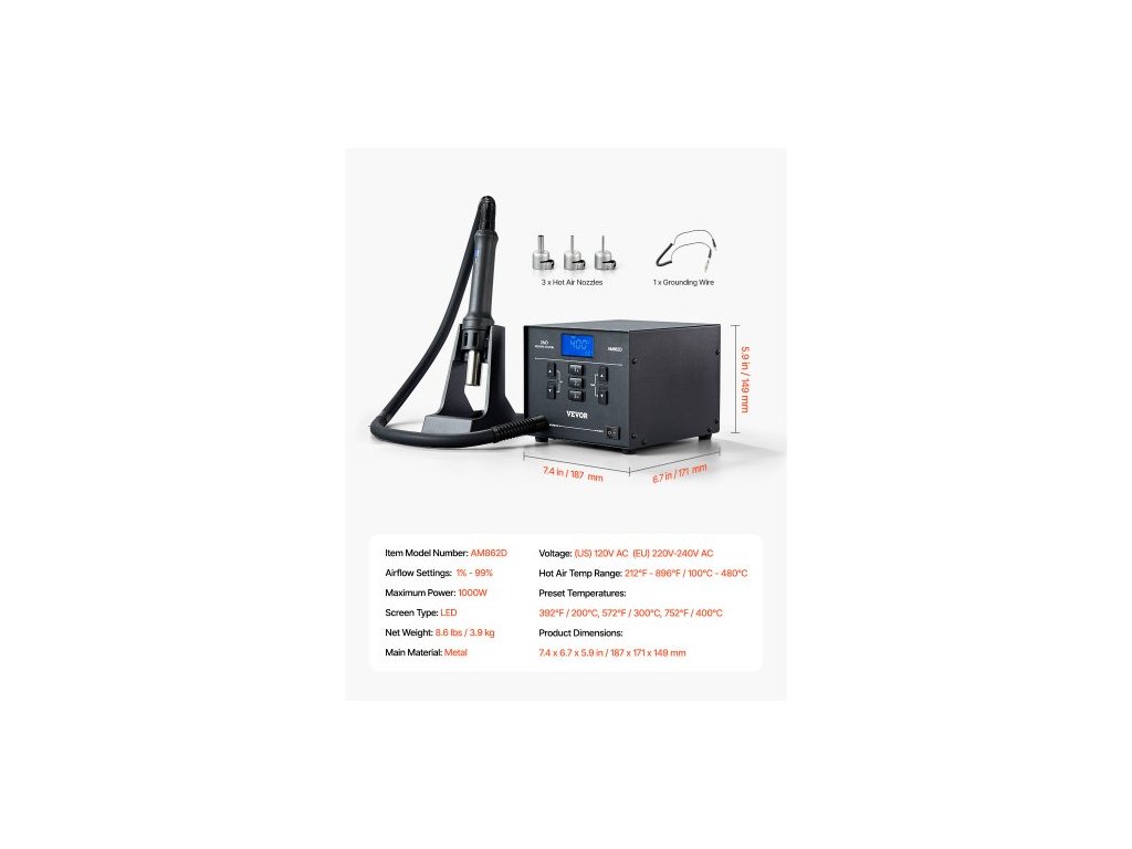 Nastavení průtoku vzduchu: 1 % - 99 %,Maximální výkon: 1000 W,Napětí: AC 220V-240V,Číslo modelu položky: AM862D,Přednastavené teploty: 392℉ / 200℃, 572℉ / 300℃, 752℉ / 400℃,Rozsah teplot horkého vzduchu: 212℉ - 896℉ / 100℃ - 480℃,Typ obrazovky: LED,Rozměry produktu: 7,4 x 6,7 x 5,9 palce / 187 x 171 x 149 mm,Čistá hmotnost: 8,6 lbs / 3,9 kg,Hlavní materiál: Kov