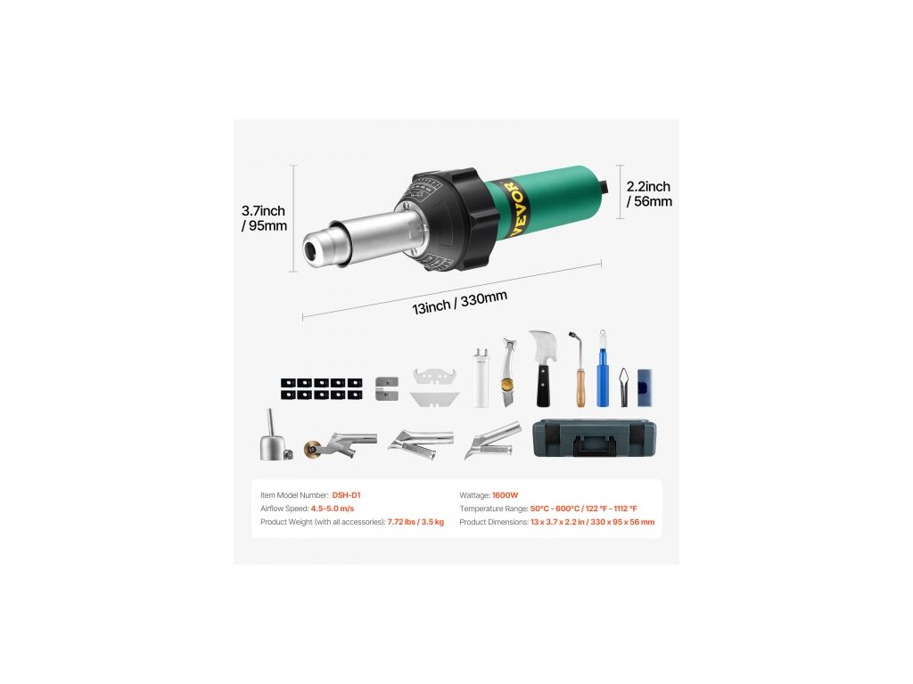 Číslo modelu položky: DSH-D1,Příkon: 1600 W,Teplotní rozsah: 50 °C - 600 °C / 122 ℉ - 1112 ℉,Rychlost proudění vzduchu: 4,5-5,0 m/s,Hmotnost výrobku (se vším příslušenstvím): 7,72 lbs / 3,5 kg,Rozměry výrobku: 13 x 3,7 x 2,2 palce / 330 × 95 × 56 mm