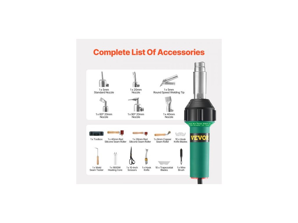 Horkovzdušná svářečka plastů , horkovzdušná pistole 1600 W, horkovzdušný hořák 122–1112 ℉, svařovací hořák na PVC, TPO a vinyl, sada pro svařování plastových střech s 17 příslušenstvími – nářadí, tryska, válec, nože pro PP/PE/PVC