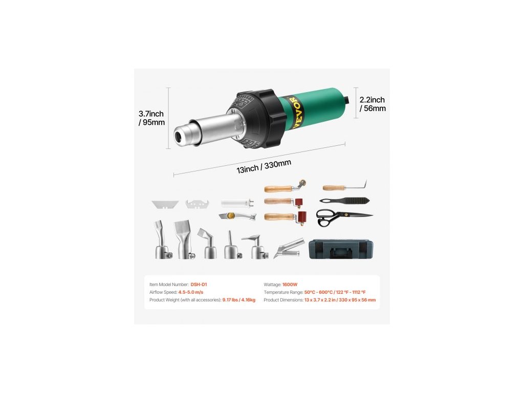 Číslo modelu položky: DSH-D1, Příkon: 1600 W, Teplotní rozsah: 50 °C - 600 °C / 122 ℉ - 1112 ℉, Rychlost proudění vzduchu: 4,5-5,0 m/s, Hmotnost výrobku (se vším příslušenstvím): 9,17 lbs / 4,16 kg, Rozměry výrobku: 13 x 3,7 x 2,2 palce / 330 x 95 x 56 mm