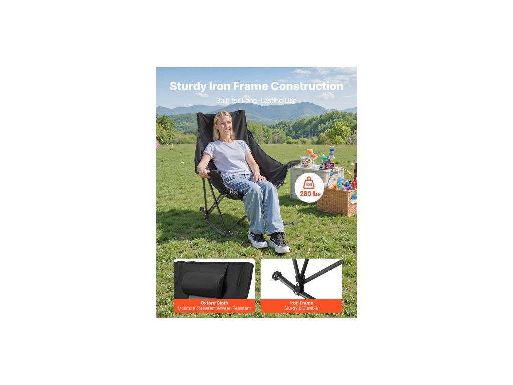 Houpací kempingové křeslo , přenosné skládací houpací křeslo, odolné zahradní křeslo s držákem na nápoje a kapsou, nosnost 100 kg, plně polstrované kempingové křeslo pro venkovní terasu, verandu, zahradu