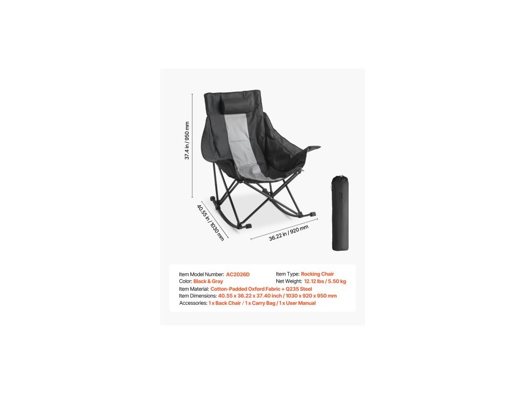 Materiál výrobku: Oxfordská látka s bavlněným polstrováním + ocel Q235,Barva: Černá a šedá,Číslo modelu výrobku: AC2026D,Rozměry výrobku: 1030 x 920 x 950 mm,Typ výrobku: Houpací křeslo,Čistá hmotnost: 5,50 kg