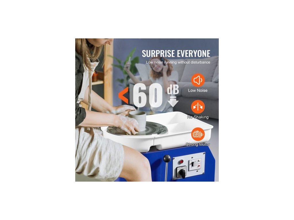 Průměr otočného talíře: 28 cm, Směr otáčení: Ve směru a proti směru hodinových ručiček, Maximální zatížení hlíny: 5 kg, Provozní hluk: 60 dB, Čistá hmotnost: 12,7 kg, Příkon: 350 W 220 V, Rozměry misky z ABS: 47,5 x 33,5 x 8 cm, Rychlost otáčení: 60–300 ot./min, Rozměry výrobku: 50 x 33,5 x 33,8 cm 38 x 35 cm