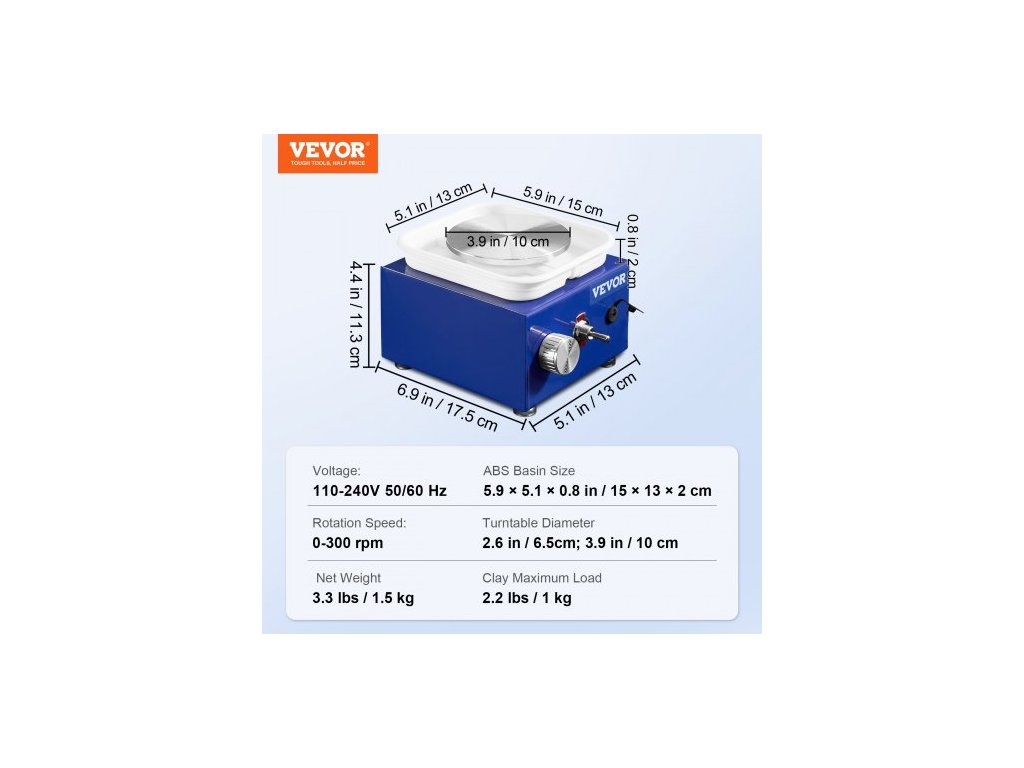 Průměr otočného talíře: 6,5 cm; 10 cm, Směr otáčení: Ve směru a proti směru hodinových ručiček, Maximální zatížení hlíny: 1 kg, Čistá hmotnost: 1,5 kg, Příkon: 30 W 220 V, Rozměry ABS misky: 15 × 13 × 2 cm, Rychlost otáčení: 0–300 ot./min, Rozměry výrobku: 17,5 × 13 × 11,3 cm
